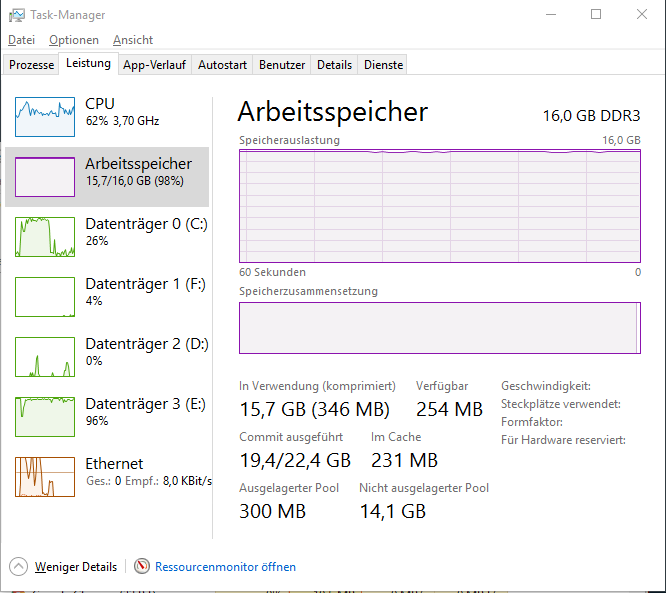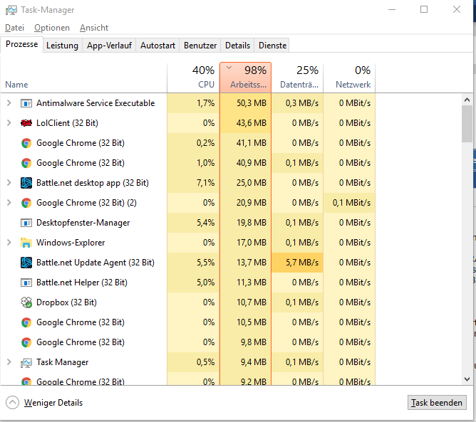Hab seit neustem häufig 98% Arbeitsspeicherauslastung, ohne das die Zahlen im Task-Manager auch nur im geringsten diesen Wert bestätigen. Habe 16 GB drinnen und hatte die ganze Zeit keine Probleme. Jetzt droppen die fps bei LoL regelmäßig auf 25 beim Spielen. Hab mal Screenshots gemacht vom Task-Manager, vielleicht könnt ihr mir ja helfen.