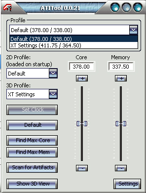 und bei 3d den xt settings wert, wenn du das ati tool im hintergrund laufen lässt ( also bei windows start ) dann wird sobald du eine 3d anwendung startest die settings für die xt geladen und sobald du zu windows ( 2d ) zurück kehrst die default settings der karte.