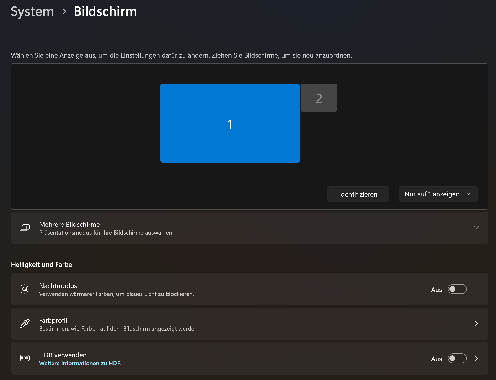 Man sieht nun, dass zwei Bildschirme "erkannt" werden. Der AV-Receiver wird, obwohl kein Bildschirm angeschlossen ist, aufgrund seiner EDID-Informationen entsprechend als Bildanzeigegerät befeuert. So, also wenn weiterhin Bildschirm 1 und 2 getrennt voneinander angefahren werden, ist der untere HDR-Schalter aktivierbar.