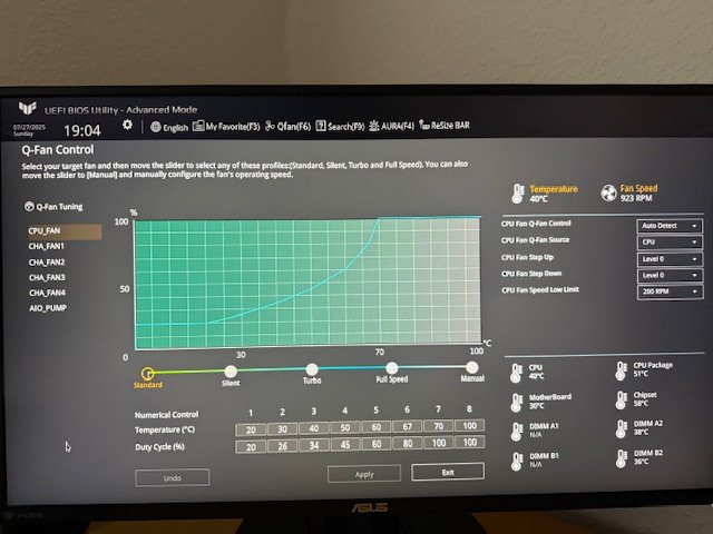 Ich weiß leider bei beidem nicht genau, wie es geht. Ins Bios habe ich geschaut, da gibt es jedenfalls eine Lüfterkurven Möglichkeit, aber was muss ich da genau einstellen?
