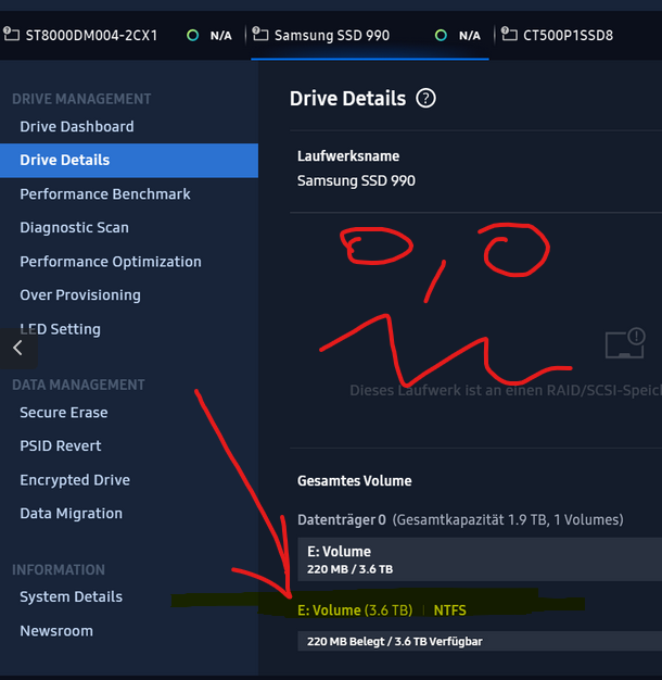 Wie @Skudrinka schon erwähnt hat : leider gar nichts. aber hier gern auch noch ein Screenshot dazu.Jiddis schrieb:hier nochmal für Blinde, Deine 990 Pro ist dein LW E: Du hast es sogar schon formatiert, Deine Screenshots von der Datenträgerverwaltung und selbst deine vermutliche zu alte Version Samsung Magician zeigt dir das an: