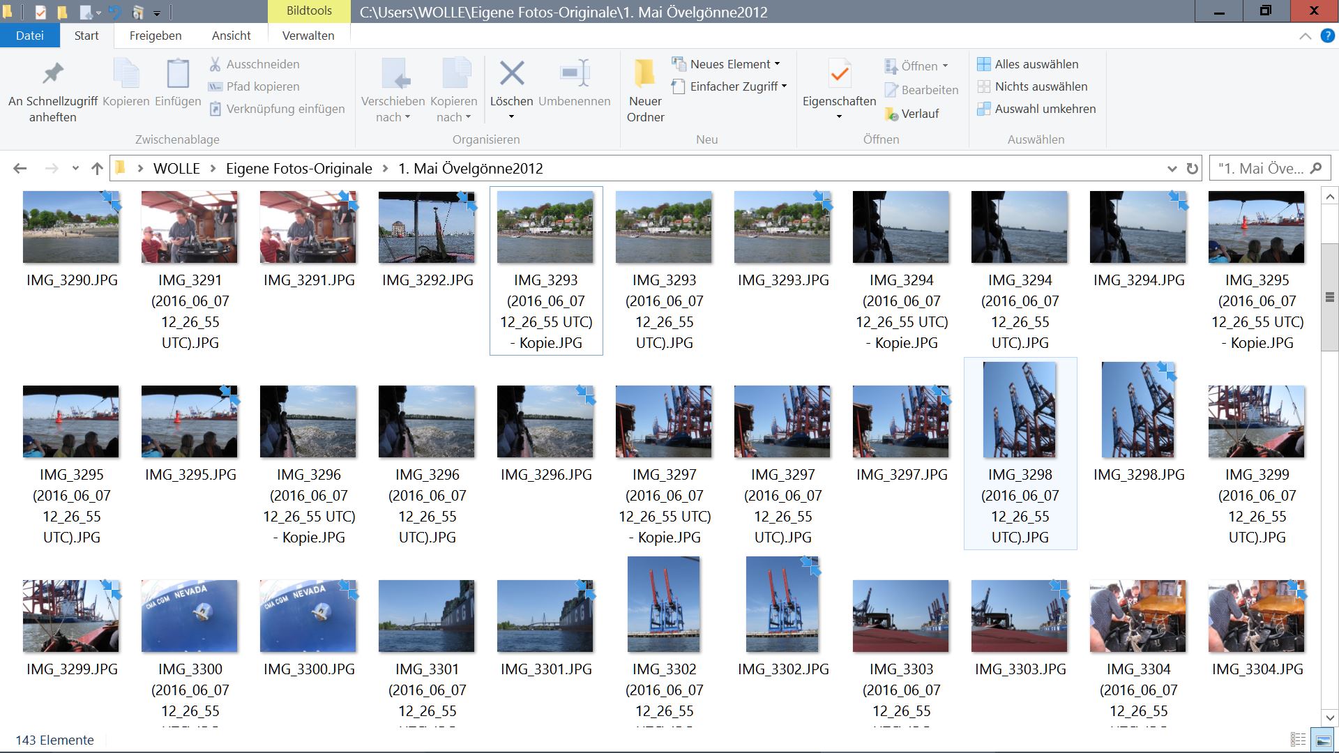 Füge mal einen Screen bei. Obere Bildreihe, Hamburg Blick auf Strandperle, Bild- IMG 3293 (2016_06_07...UT).JPG klick ich an zum löschen. Links davon erzeugt Wind. gleich eine Kopie, mit gleichen Daten. Rechts ist das Originalbild.