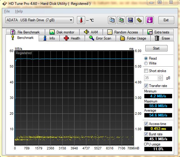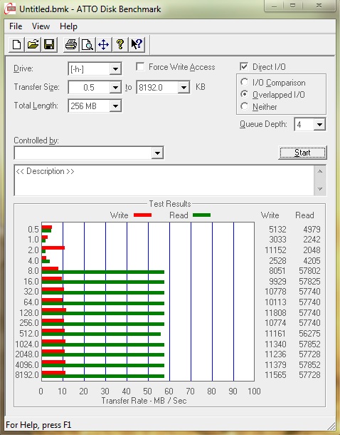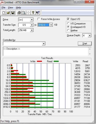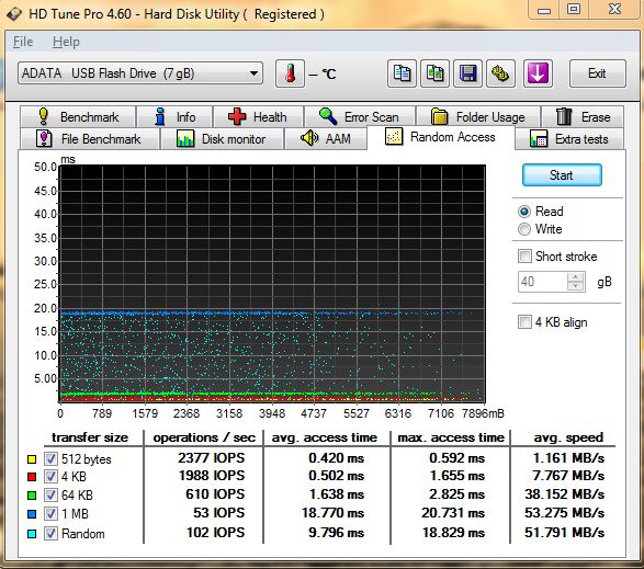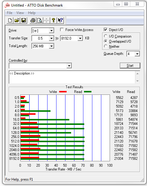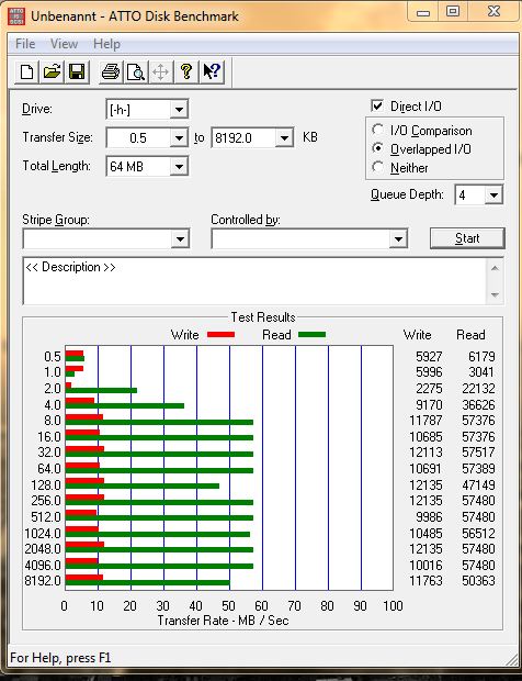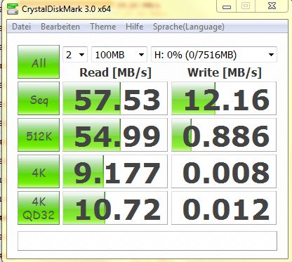 Ich habe diese Werte mit ATTO Benchmark überprüft und bin zu folgenden Ergebniss gekommen: Von 0.5K bis 4K sind die Werte im Lesen maximal 11MB/s und im Schreiben maximal 5MB/s.