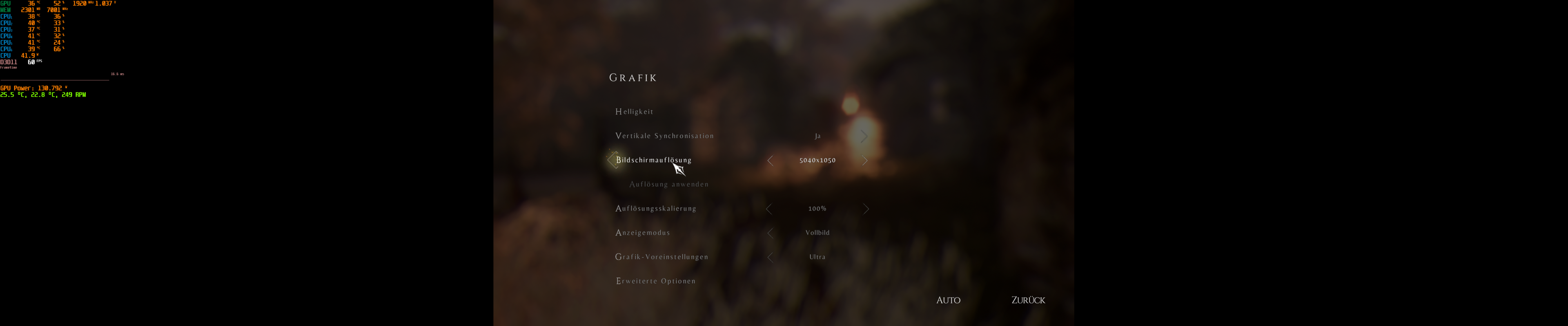 ich verwende ein Triple Screen Setup mit drei 22"-Monitoren und einer Auflösung von 5040 x 1050 px.