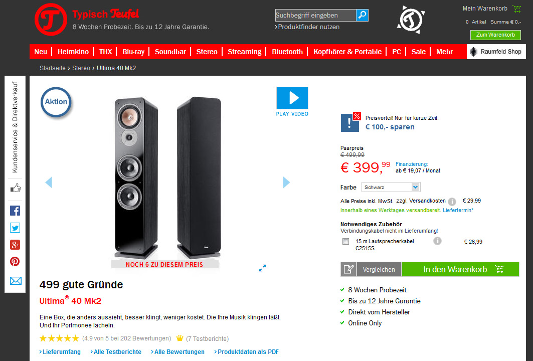 Dazu muss noch gesagt werden, dass man bei Teufel NICHT kaufen sollte, wenn nicht gerade eine Aktion ist. Sprich, manchmal gibt es was dazu oder manchmal gibt es Rabatt, letztens erst 70 Euro auf die Ultima 40 MK2, so dass sie dann nur noch 429 Euro kosten!