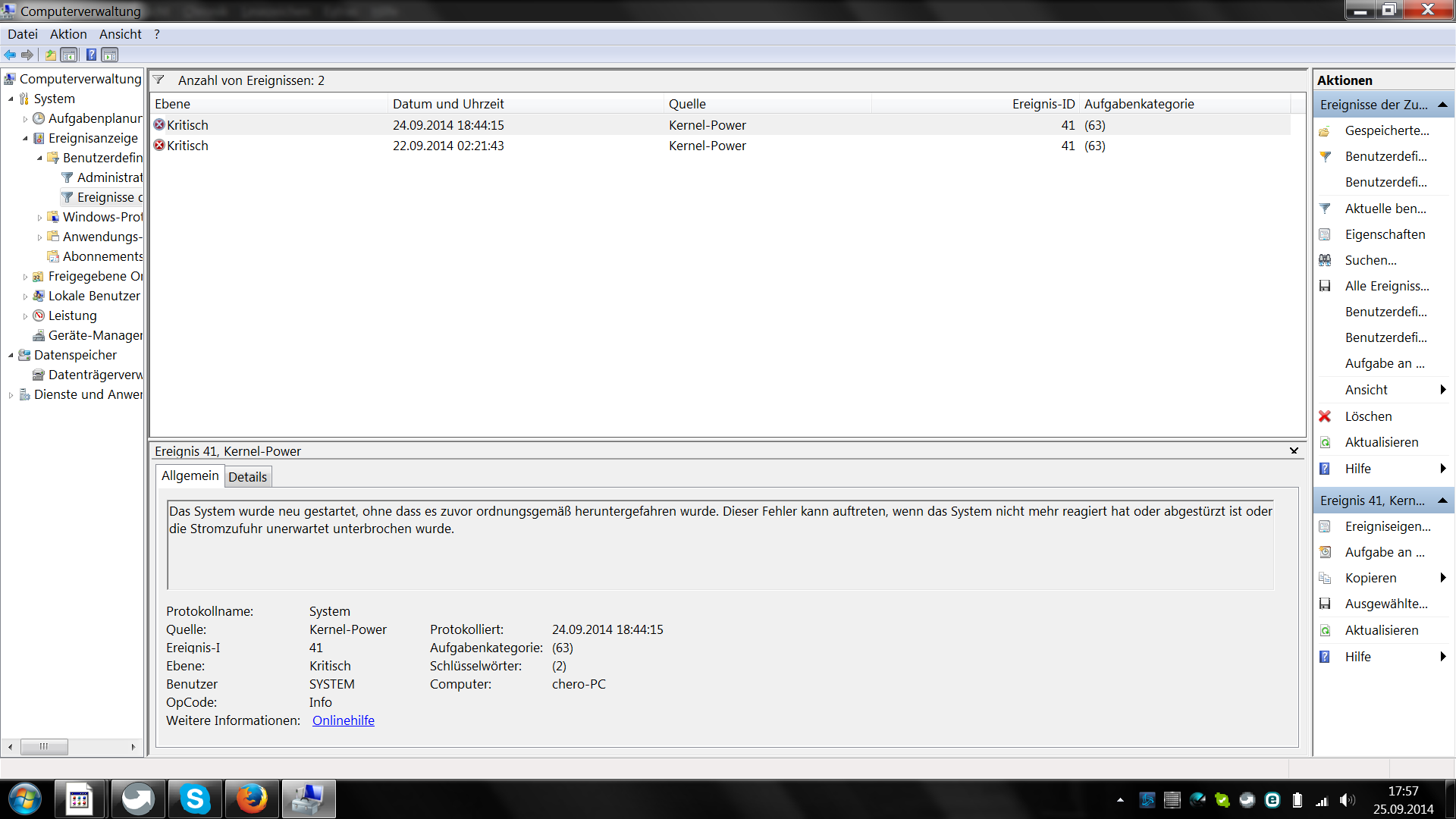 Ich habe nun Windows 7 auf der anderen SSD erneut installiert und wartete ab ob sich dieses "kernel-power"-Problem damit erledigt hat. Hat es nicht!