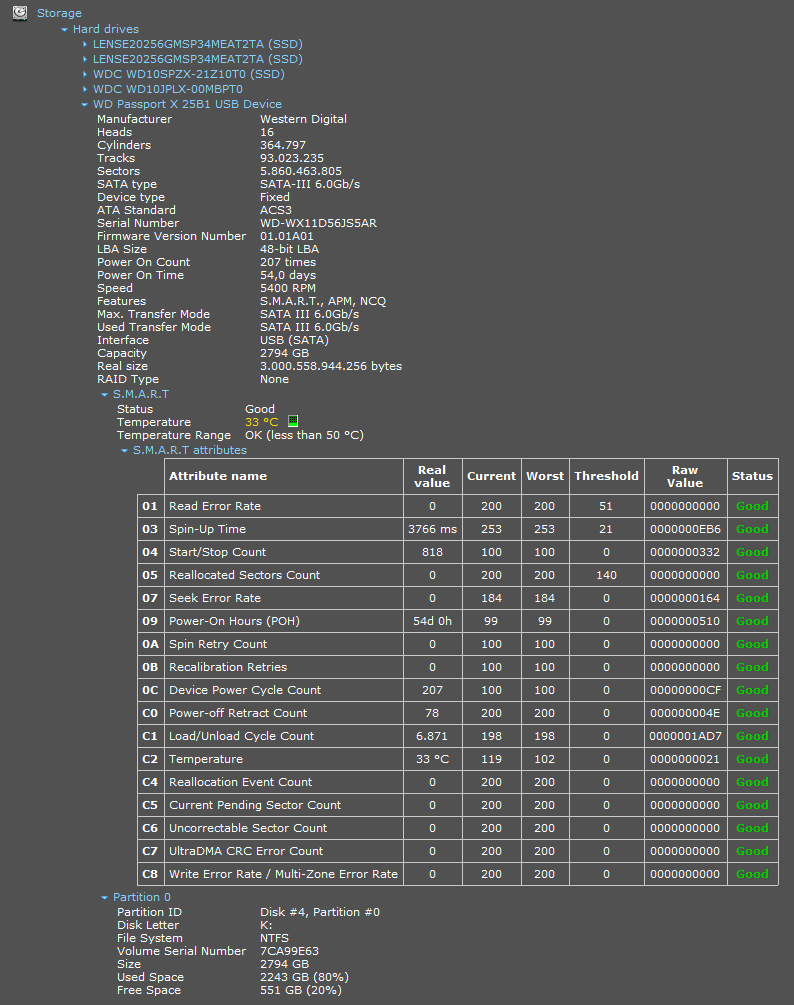 Also nachdem ich vor ein paar Tagen eine Synchronisation zur Festplatte laufen ließ, klickte die Festplatte während des Schreibens und war dann jeweils kurz nicht mehr verfügbar, sodass ich mehrere Anläufe brauchte. Als ich dann gesehen habe, dass sich die Suchfehlerrate mehr als verdoppelt hat, habe ich den Händler kontaktiert, der mir dann zunächst SeaTools empfahl, um die Platte zu checken - jedoch erkannte das Tool die Platte nicht. Ich habe dann eine Rückgabe und Kaufpreiserstattung vereinbart. Sicherung lief soweit noch ganz gut, beim Lesen gab es erstmal keine Probleme. Aber beim Datenschreddern wurds schon heftig - als ich die Festplatte mit Nullen beschrieben habe, gab es alle paar Minuten I/O Fehler und Geklicke. Mittlerweile können nicht mal mehr die Smartwerte abgerufen werden. Also von diesen portablen Festplatten nehm ich erstmal Abstand.