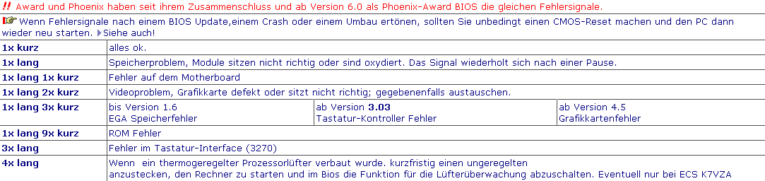 Das System startet für ca. 10 Sek., gibt die genannten Töne und schaltet sich selbstständig ab. Auf dem Motherboard Fehlercode Display kann man 9.C ablesen (nachdem das System sich abschaltet) - was dass bedeuten soll ist weder im Handbuch noch auf der Abit Homepage ersichtlich.
