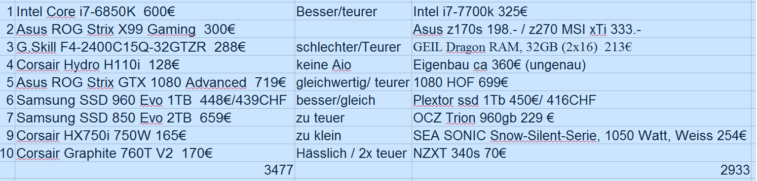 Also bitte ich EUCH, meine Fragen bezüglich Bauteilen, innerhalb des Segmentes zu bewerten. Anmerkungen sind immer gestattet (zB. wart ich Ryzen sicher noch ab) und kann auch nicht alles zu jedem Thema im Internet recherchieren, ausserdem habe ich Preisspanne mehr als deutlich angegeben absolutes MAX. ohne Wakü/M.2 2500.- /mit 3100.- /alles komplett 4400.- und wenn ich doch auf ebay kaufen wollte, dann such ich zusammen und Frage.