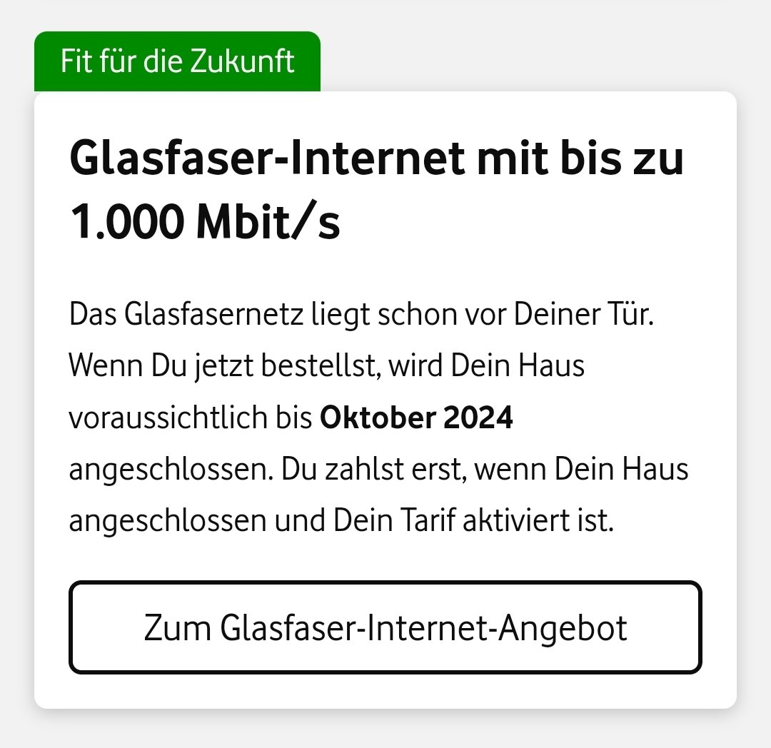 Das ich nicht lache. Vodafone meint, ich könnte noch diesen Monat Glasfaser bekommen. Deutsche Glasfaser bekommt es seit über einem Jahr nicht hin. Da haben sich zwei gefunden. 😵💫