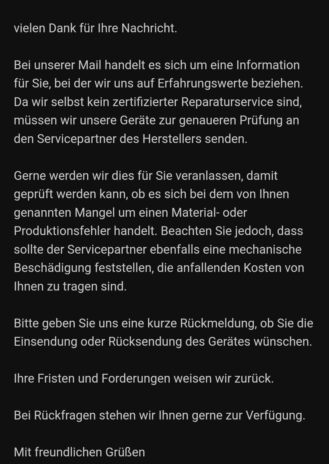 Klar ist es ärgerlich und wird bestimmt auch so einige Fälle von Betrug geben. Aber eben nicht pauschal unterstellen. Der Händler kann ja gerne erstmal auf eigene Kosten prüfen ob Fremdeinwirkung vorliegt und muss dann eben klagen. Oder er verbucht es als Verlust oder. Aber als Verbraucher würde ich hier auch auf Reparatur etc. pochen.