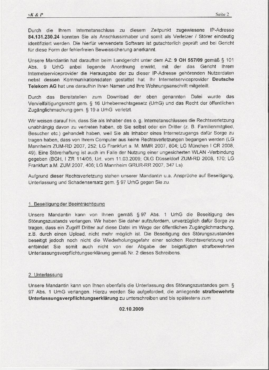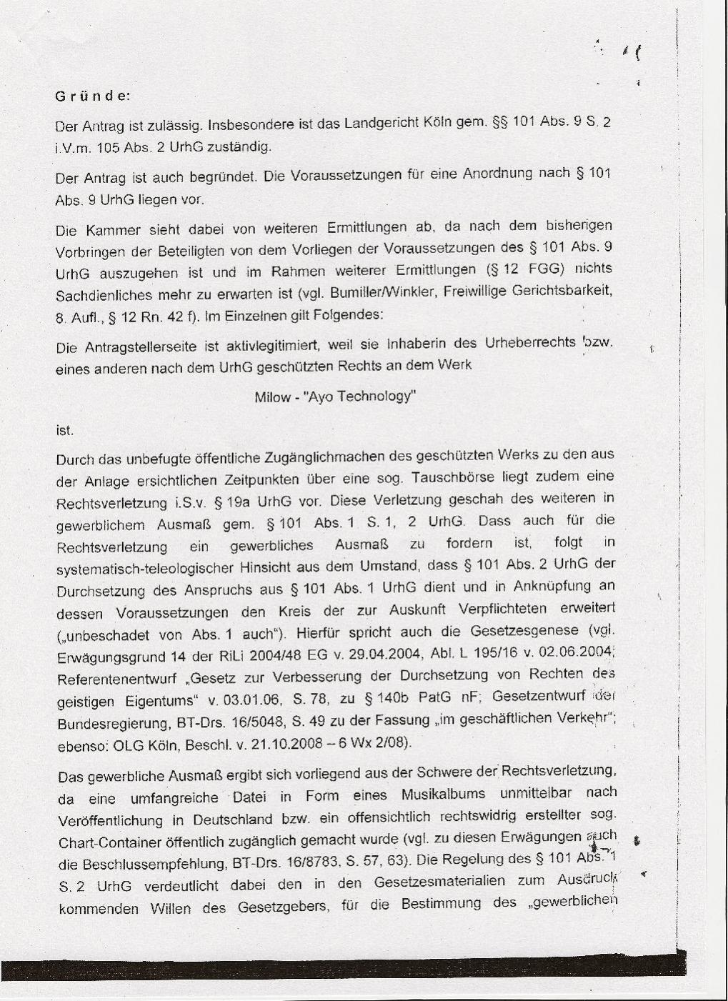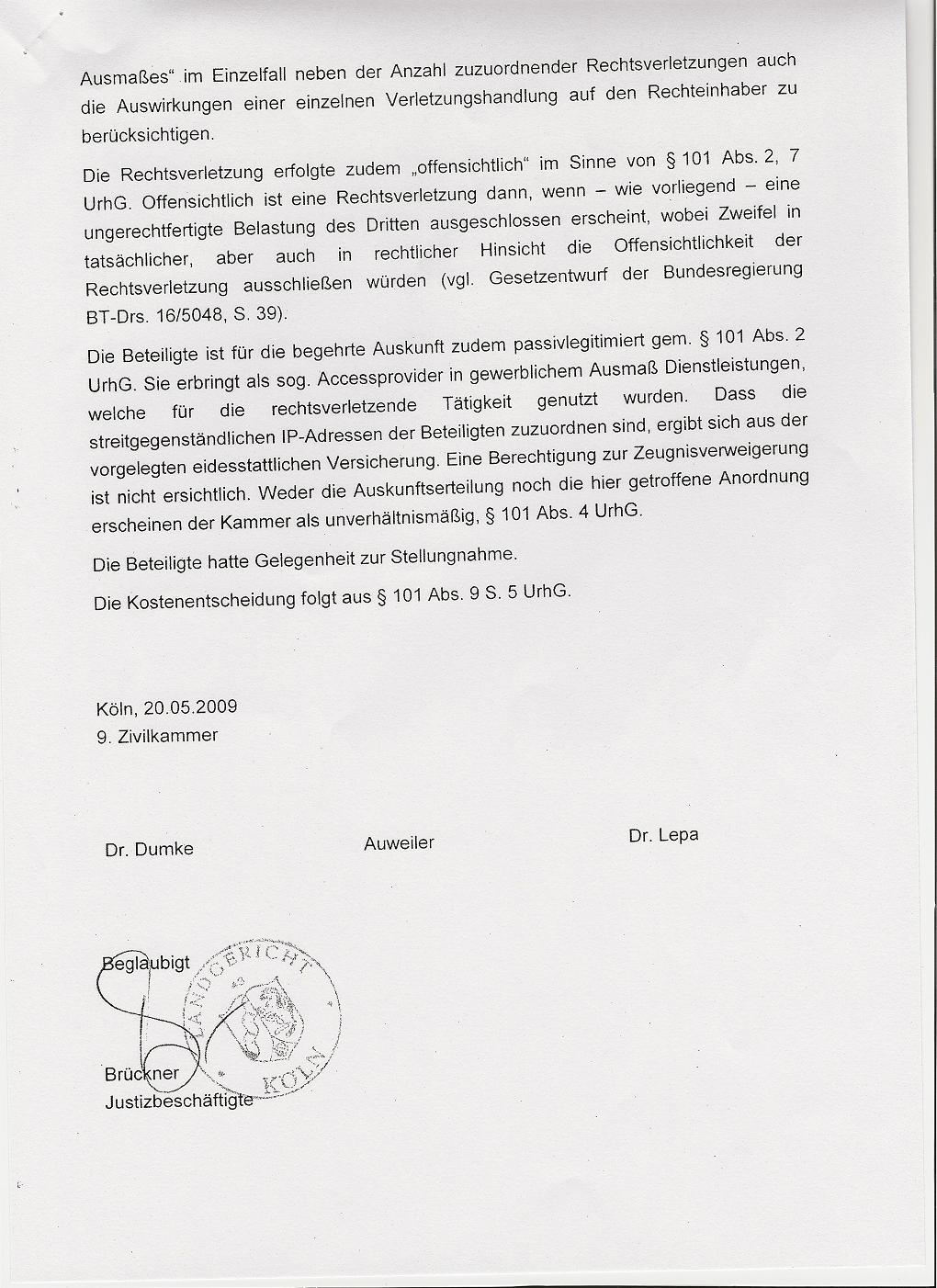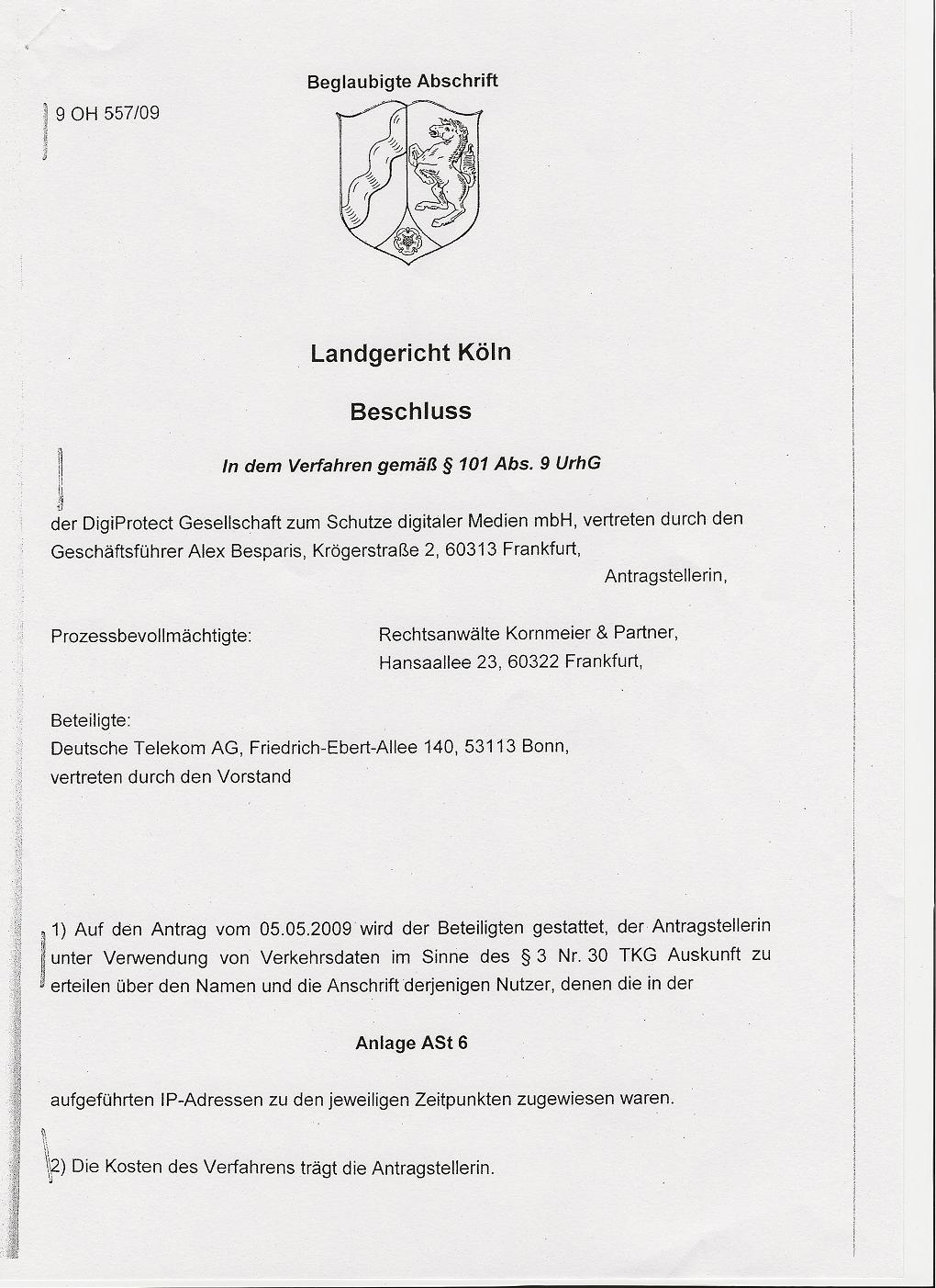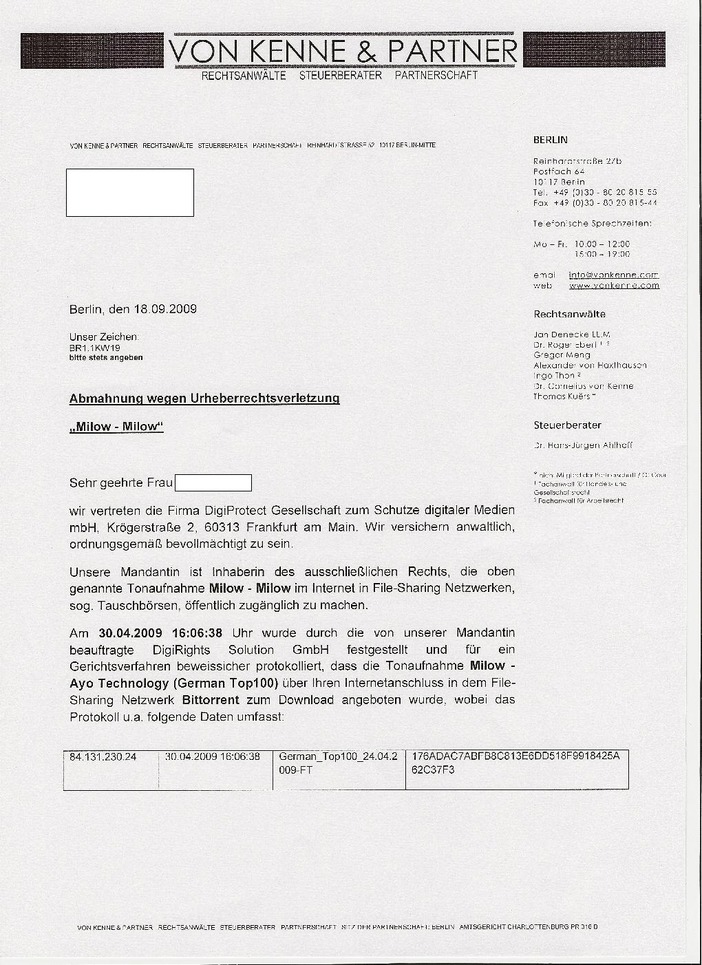 am 30.04.2009 um 16.38 Uhr wurde durch unseren Mandanten festgestellt, dass sie illegale Tonaufnahmen über das Netzwerk Bittorent zum Download angeboten haben...