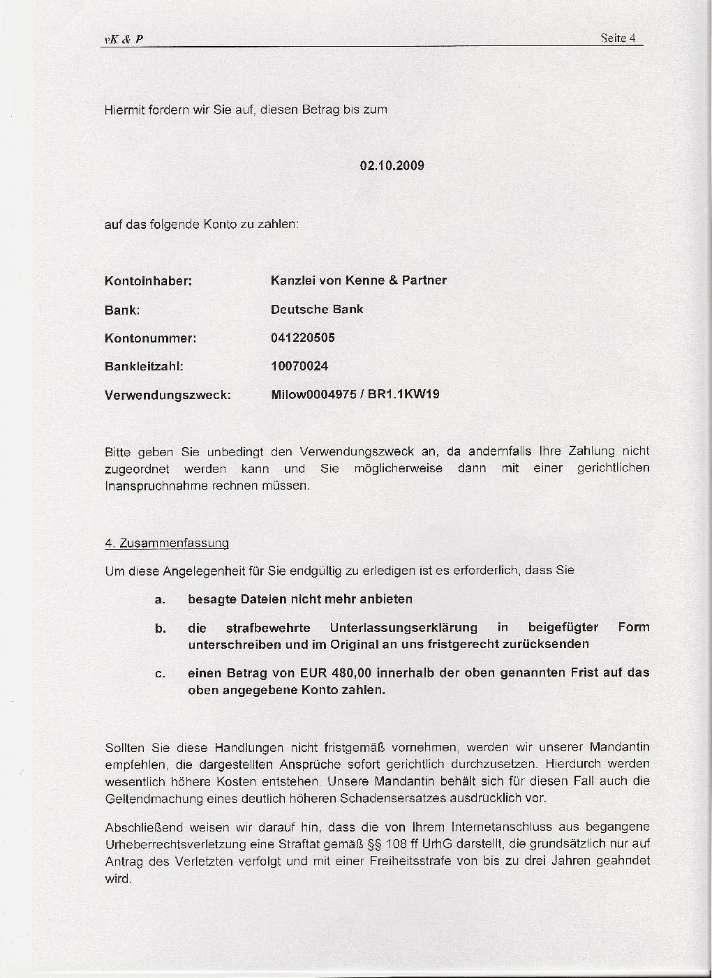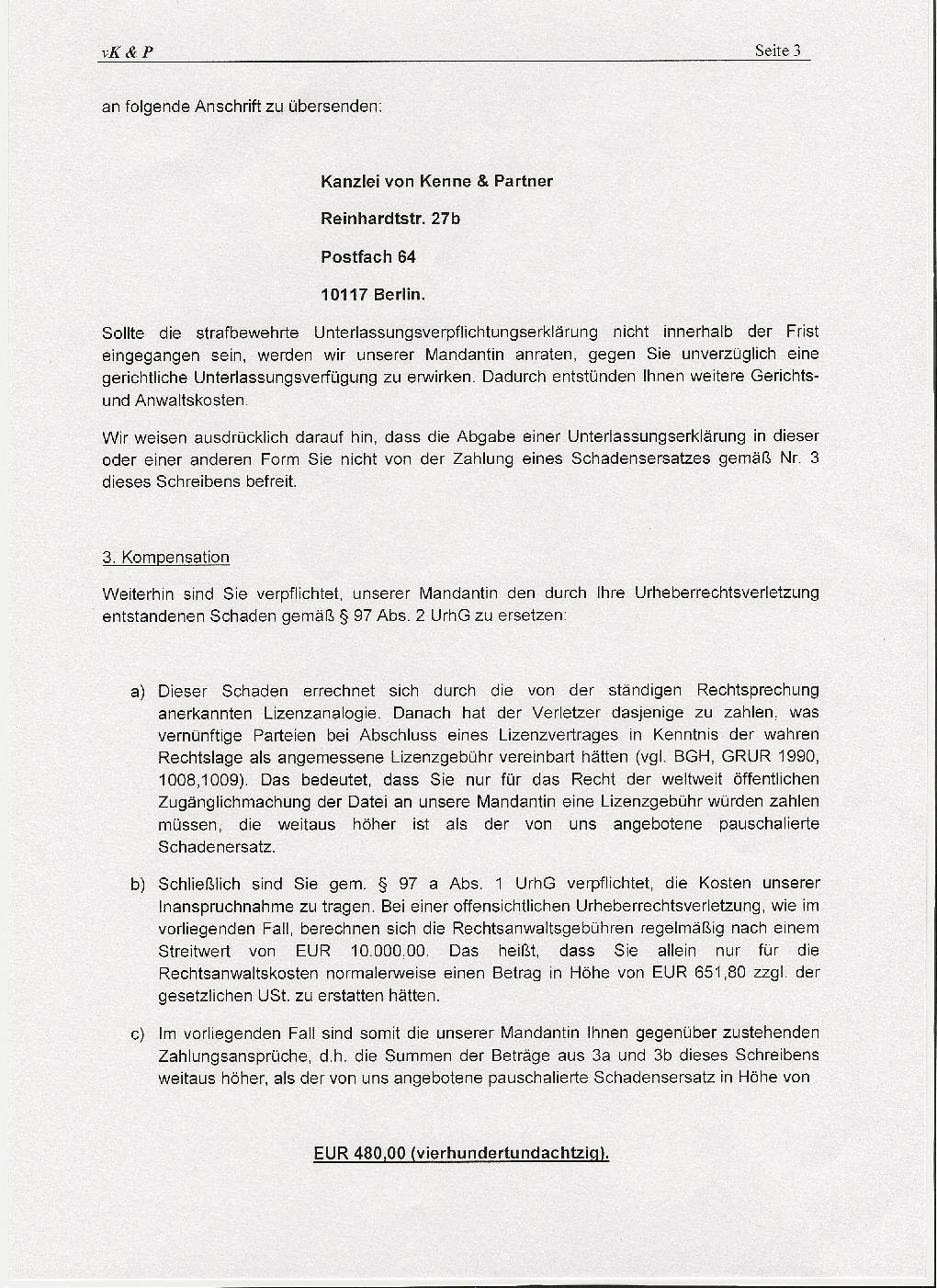 jetzt fordert der Anwalt, eine Unterlassungerklärung, und ein Bußgeld in Höhe von 480 Euro, bis zum 02.10.2009