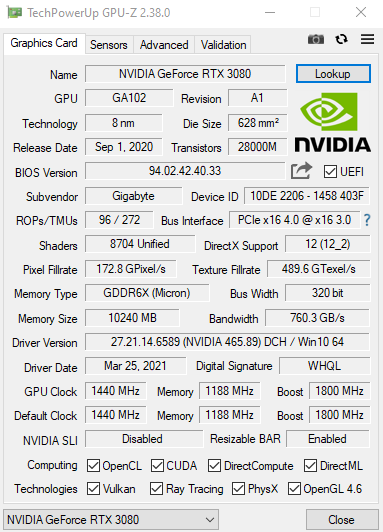 ich wollte das neue Resizable Bar ausprobieren. Ich habe eine RTX 3080 sowie ein I9 9900k und das Mainboard Gigabyte Z390 G1 Gaming
