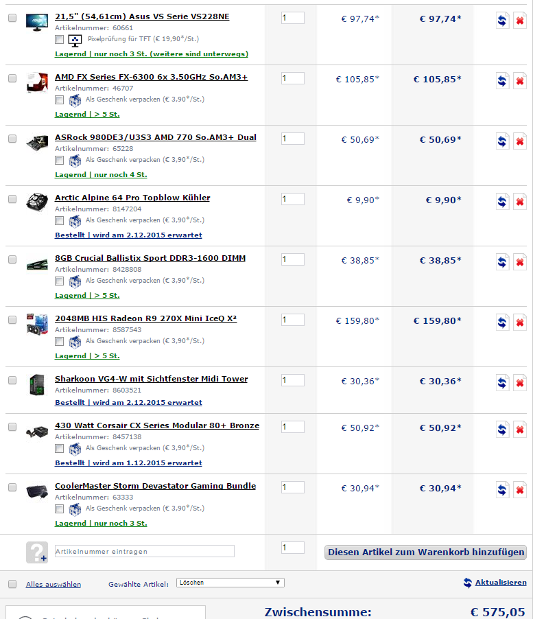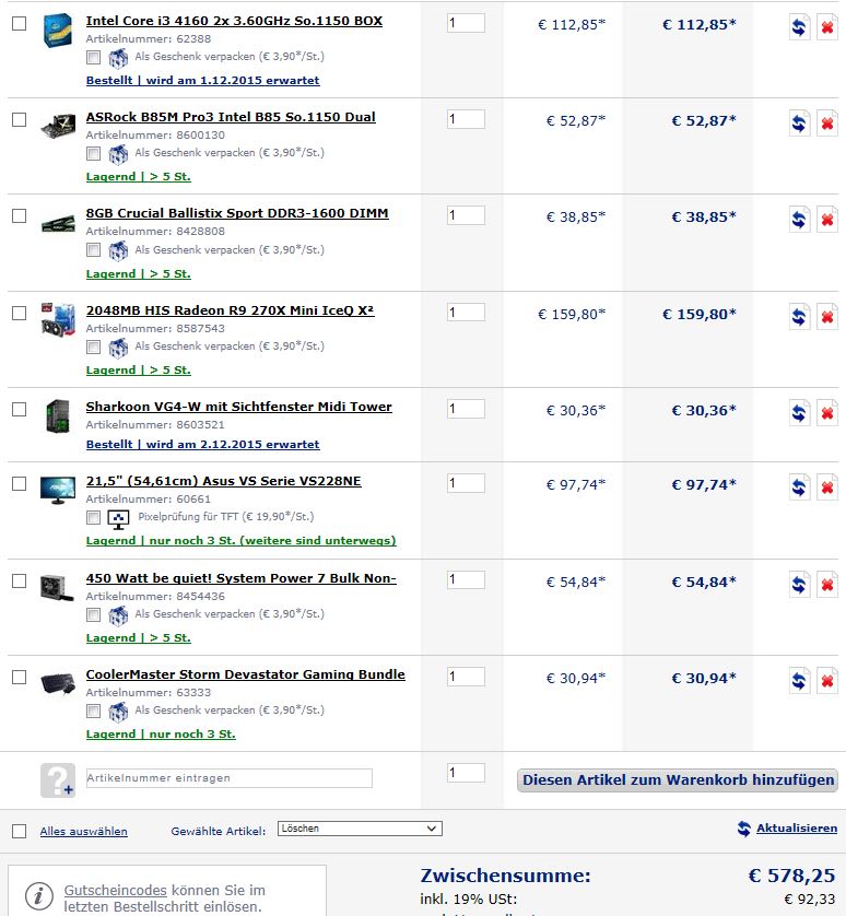 Das einzige was entfällt sind Festplatte und DVD-Laufwerk, da hab ich noch eine 1TB Caviar Black und einen LG Brenner.