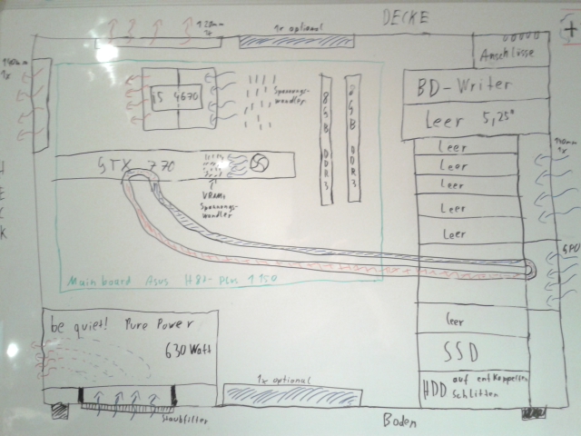 an der Gehäusefront blasen der Standardkühler und der Heat Exchanger der 770 hinein; an der Unterseite bläst der Kühler des Netzteils in das Netzteil; an der Rückseite bläst der 2. Standardkühler hinaus; und an der Oberseite bläst der Noiseblocker B12-1 hinaus; gleichzeitig wird im inneren die Luft des Towerkühlers der CPU von hinterem und oberem Lüfter abgesaugt.
