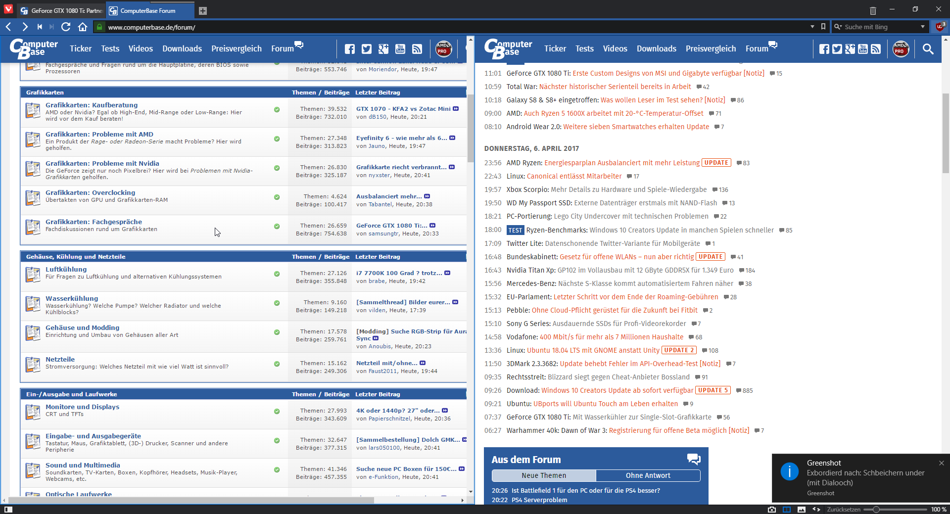 Ich nutze gerne CB im Splitscreen Modus von Vivaldi. Auflösung ist FHD.