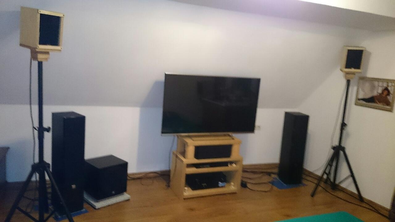 Der Subwoofer steht vom Fernseher 30 cm und vom AVR 50 cm weg.