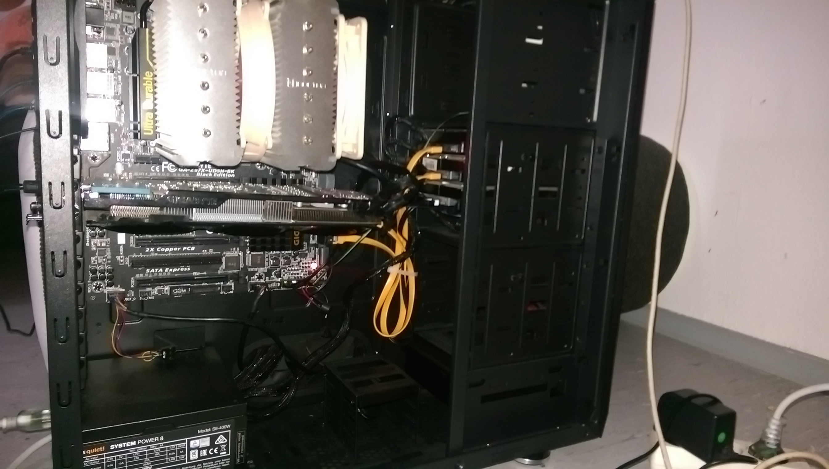 ...ich habe den Rechner ein wenig aufgeräumt und versucht so viel Kabel wie möglich hinter das Mainboard zu klemmen. Leider ist das nicht immer möglich, da das MB sehr kompakt ist (Anschlüsse direkt über der Graka) oder die Kabel zu kurz sind. Tatsächlich bin ich etwas mit der Kühlung runter gekommen (max CPU 64°C, GPU weiterhin bei max 85°C).