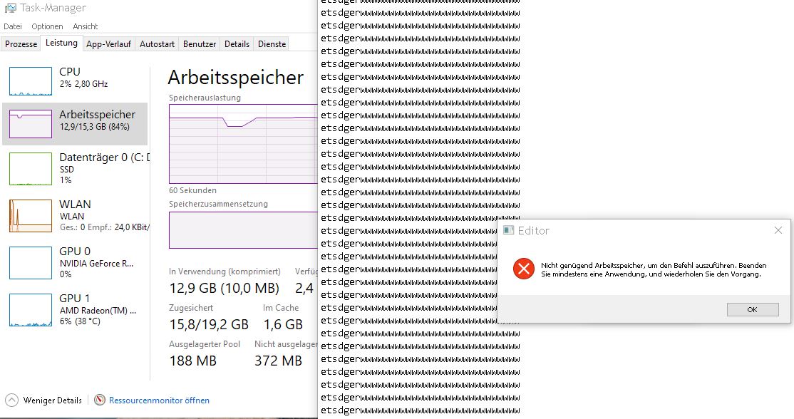 Wenn ich z.B. ganz ganz viele Zeilen in den Editor einfüge, bis der RAM voll ist, kommt die Fehlermeldung wie im Anhang.