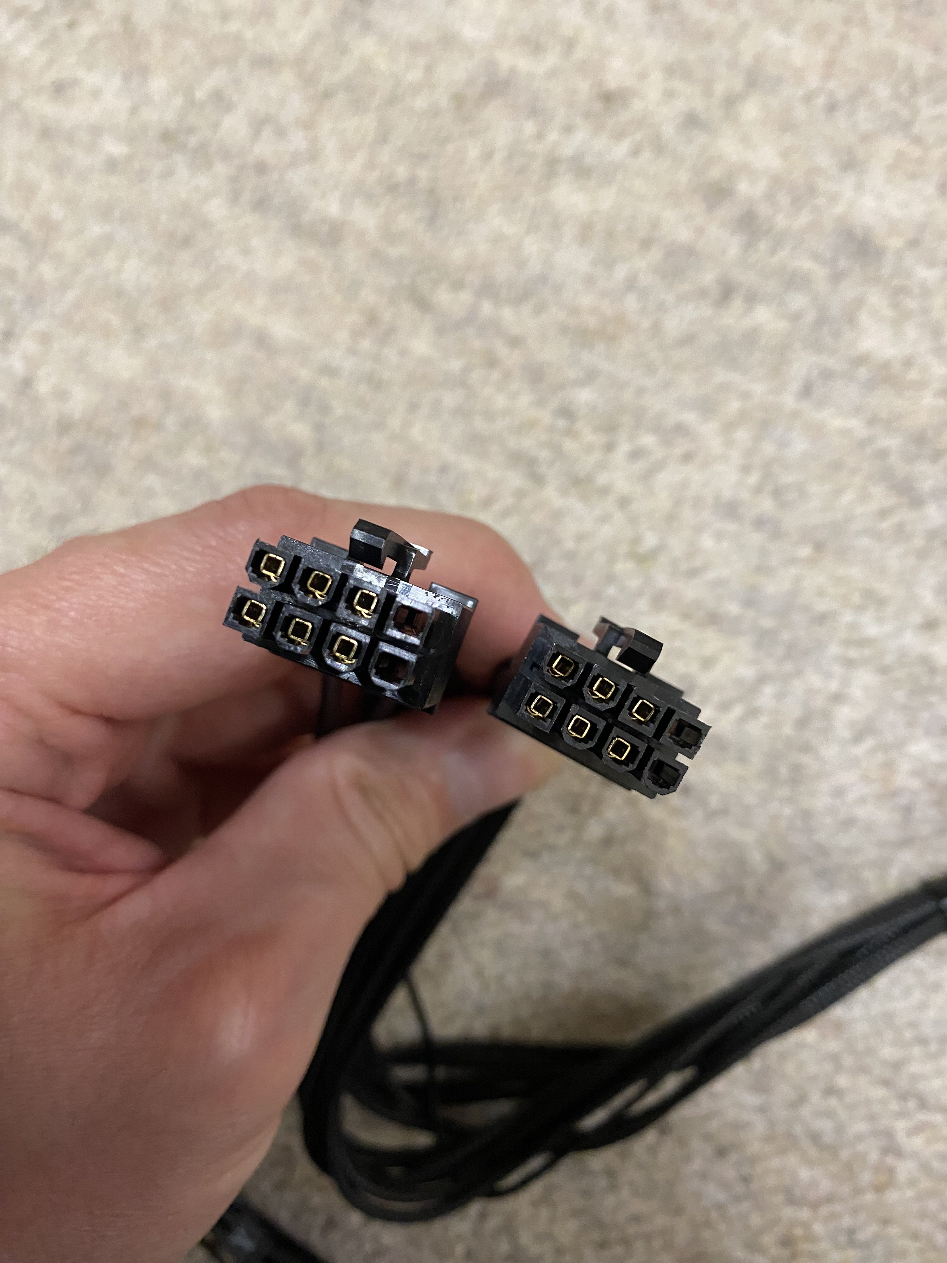 Eine Überlegung: Es sind ja vermutlich (!) die Sensepins, die nicht gut funktionieren, vermutlich, weil der Stecker nicht 100% stabil sitzt, daa es keinen Plasteschnapper gibt. Mein Adapter hat keine Sensepins ... die eingesteckten 8-Pin-PSU-Kabel können die nicht weiterleiten. Die Sensepins sind also an sich optional, um die GraKa zu betreiben. ... damit könnte ich diese beim Originalkabel des PSU auch kappen, und alles sollte gehen?