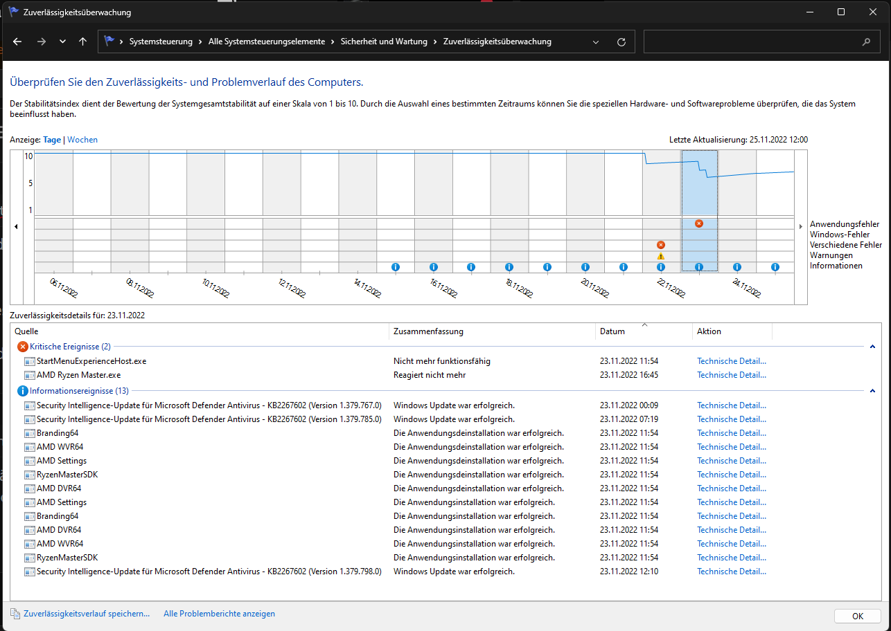 Das System wurde zuvor am 25.11.2022 um 12:35:52 unerwartet heruntergefahren.