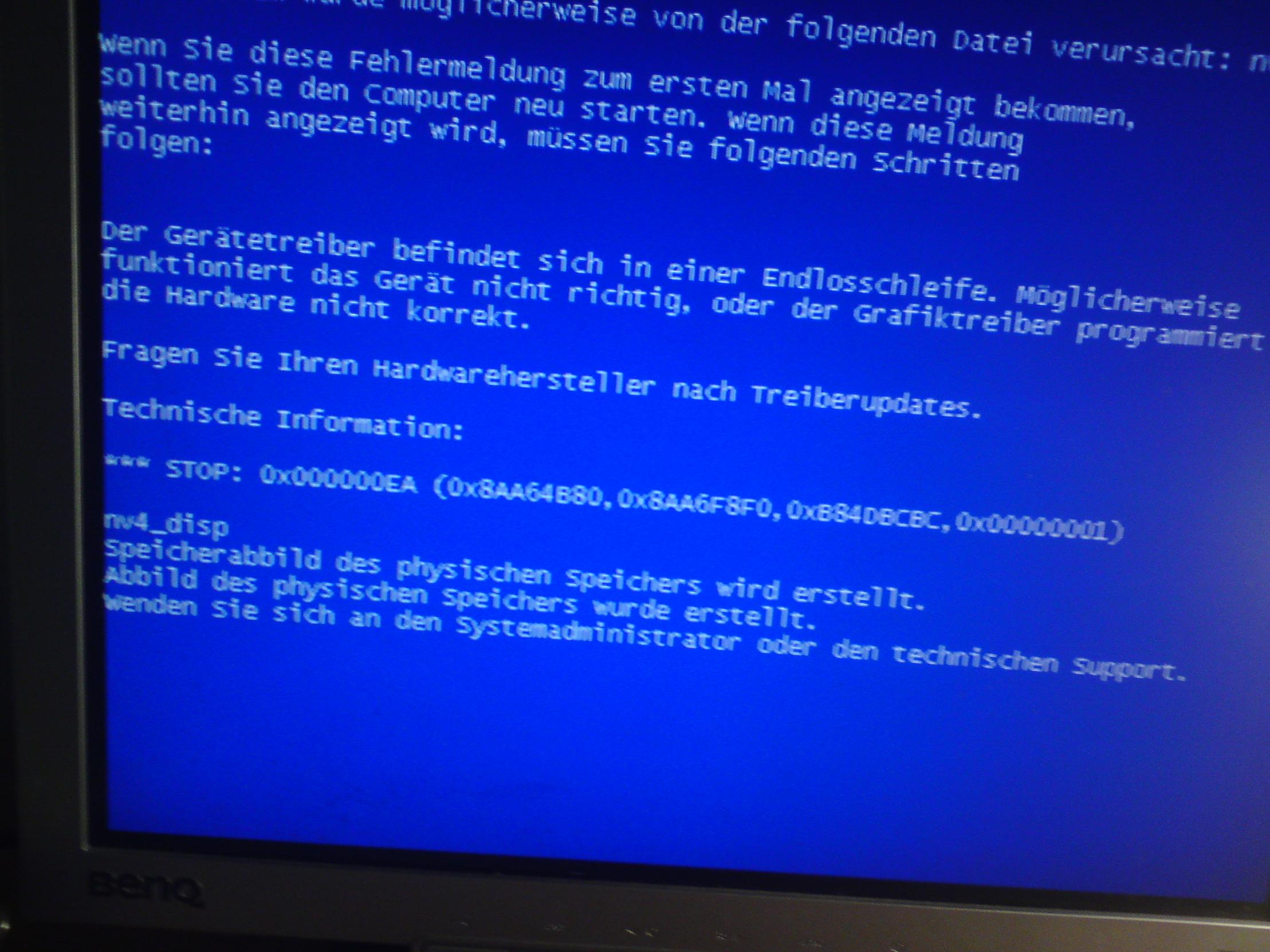 da steht dann noch diese Fehlermeldung: Stop: 0x000000EA (0x8A9AEDA(, 0x8AC1D198, 0xB224ECBC, 0x 00000001)