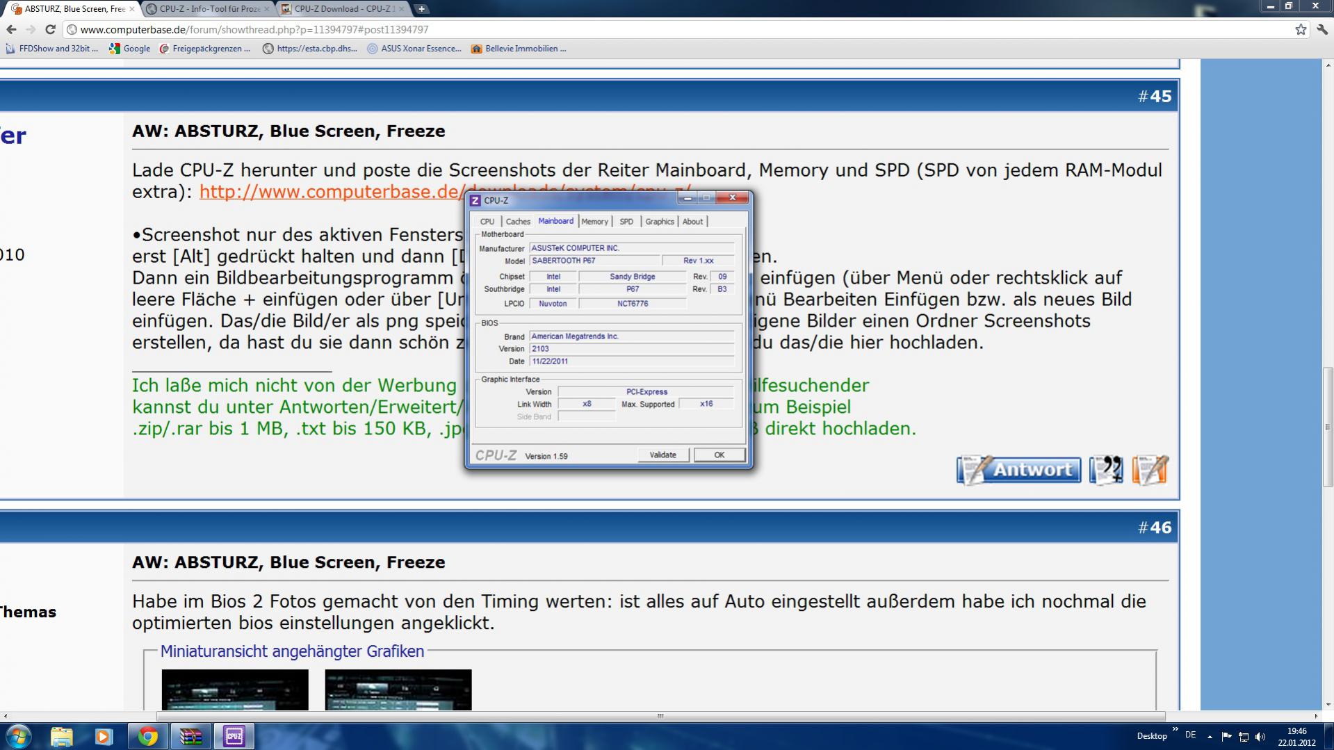 langsam glaube ich das ist ein Problem von deinem SABERTOOTH P67 und dem Corsair CMZ8GX3M2A1600C9, weil dieses mal knallt es beim Kernel (BalanceManager). Wie sind die Timings? Command Rate 1 oder 2?