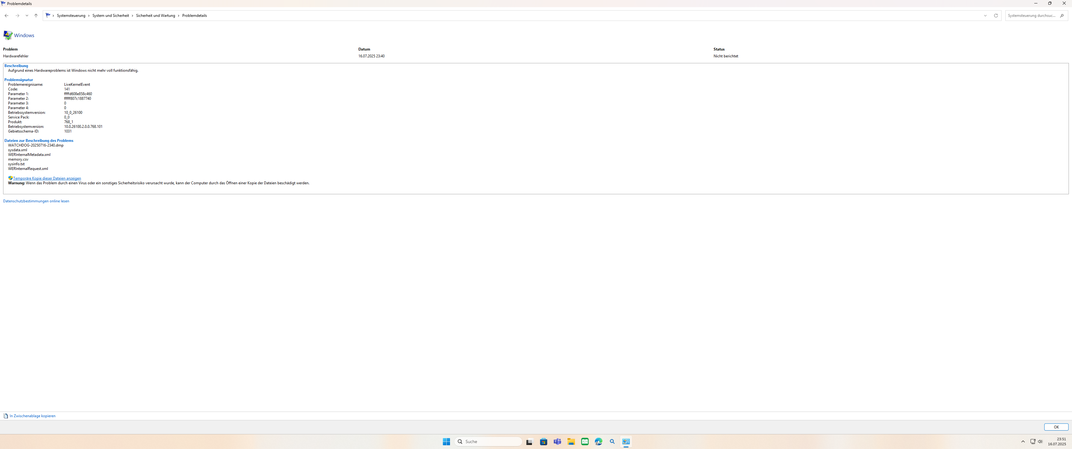 2. Beschreibe dein Problem. Je genauer und besser du dein Problem beschreibst, desto besser kann dir geholfen werden (zusätzliche Bilder könnten z. B. hilfreich sein):Heut beim spielen hatte ich plötzlich einen schwarzen Bildschirm und nichts ging mehr. Ich konnte auch nicht mehr in den Taskmanager. Ich habe dann den Computer neu gestartet. Dann habe ich den Zuverlässigkeitsverlauf geöffnet und gesehen das ich seit ein paar Tagen Hardwarefehler habe. Ich habe es aber erst heut gemerkte. Die fehlermeldung habe ich unten angepinnt, leider kann ich damit nichts anfangen und hoffe das mir hier jemand weiterhelfen kann.