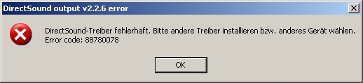 . Ich war vorhin gemütlich am Musikhören, als Winamp sich plötzlich weigerte Musik wiederzugeben. Plötzlich erschien die Fehlermeldung im Anhang. Daraufhin hab ich im Inet nachgeschaut, und die verschiedenen Audioausgaben ausprobiert (DirectSound etc.), allerdings ohne Besserung. Auch der Windows Media Player weigert sich zu spielen, und das "Ah-Oh" und das Klopfen beim ICQ bleibt ebenfalls aus...