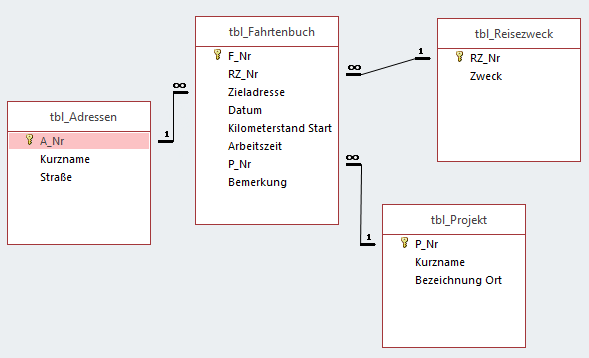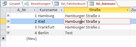 Die gleiche Funktion habe ich auch bei Start und Ziel verwendet. Dies klappt auch, allderdings zeigt mir Access immer nur den Fremdschlüssel der Adresse auf der tbl_Adressen an. Ich möchte allerdings natürlich den Text, z. B. Hamburg angezeigt bekommen.