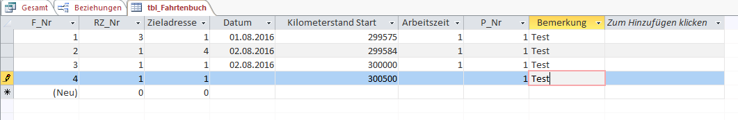 Ich habe eine tbl_Fahrtenbuch, die das Ziel und den Kilometerstand beim Start enthält.