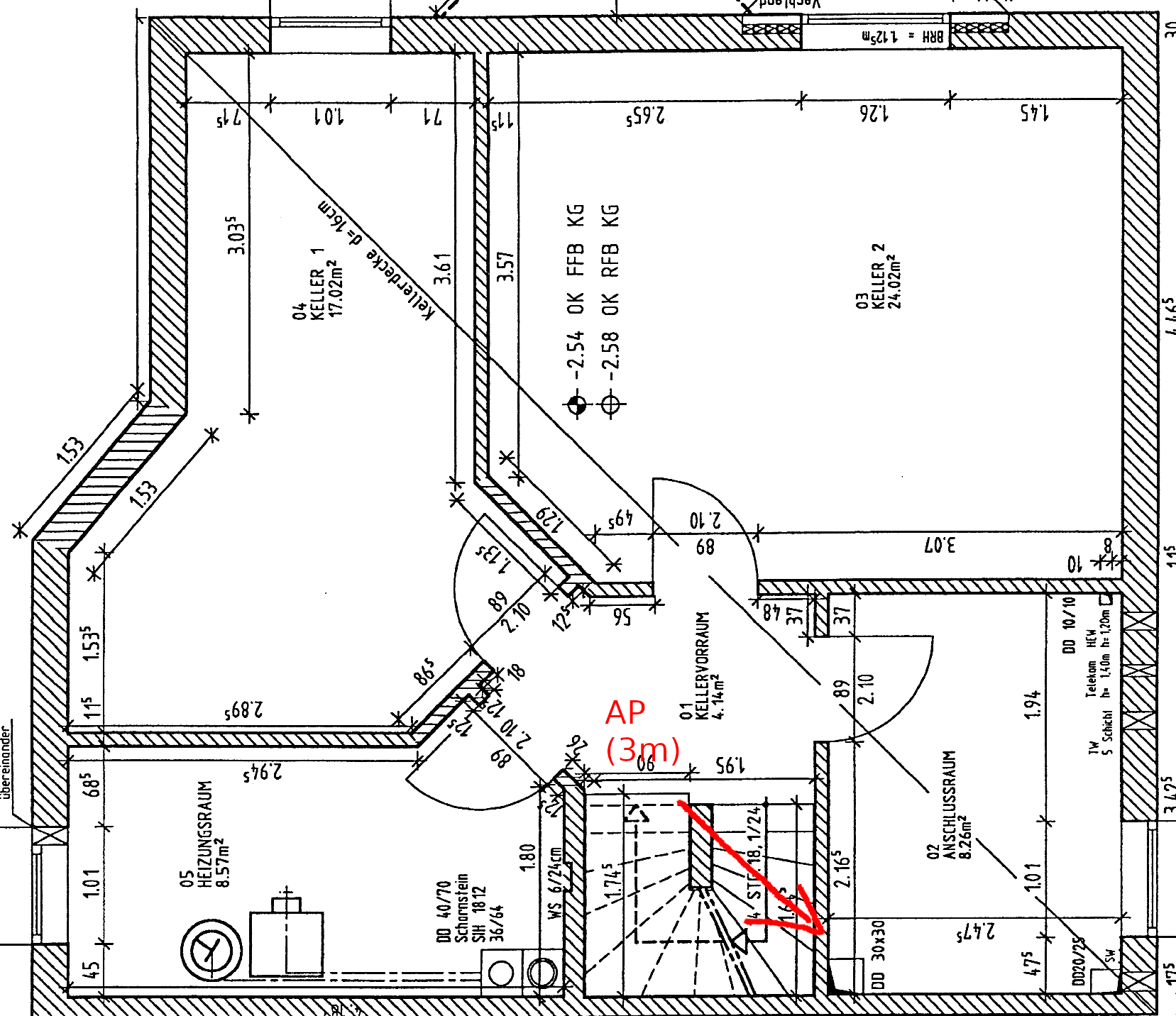 Recht einfach kann ich einen Access Point im Kellerraum 2 und einen oder zwei Access Points im Treppenhaus installieren. Mit etwas Aufwand auch jeweils in Diele und Flur. Das Treppenhaus ist offen, d.h. es ist eine offene Holztreppe.