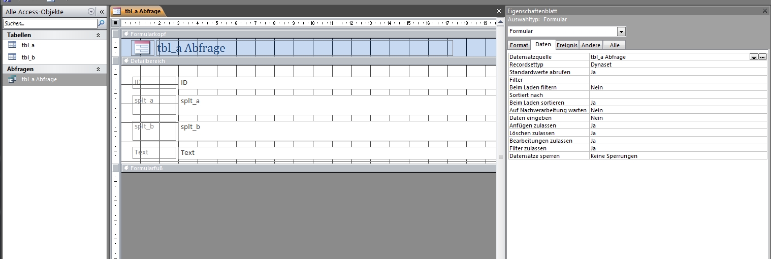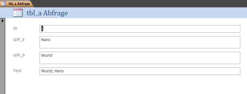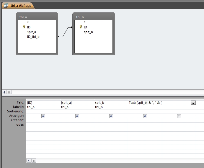 Die Frage ist jetzt genau diese, was dafür geeignet ist. Meiner Erfahrung nach, kann ich in tbl_a natürlich diesen string nicht zusammensetzen und brauche dafür eine Abfrage. Eine SQL-Abfrage lässt sich aber nicht in einem Textfeld im Formular darstellen. Nur ohne Referenz und mit "Dlookup", aber das wäre sinnlos.