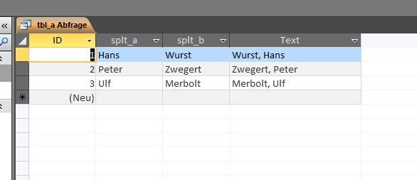 Splt_a und splt_b sollen gemäß der jeweiligen ID zusammengefügt werden und in einem Textfeld auf einem Formular erscheinen.