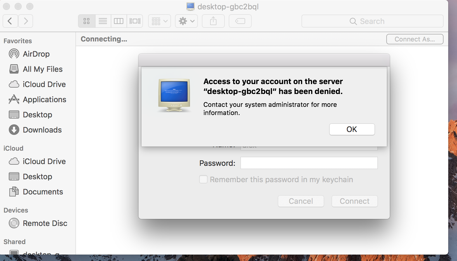 Access to your account on the server "PC" has been denied.
