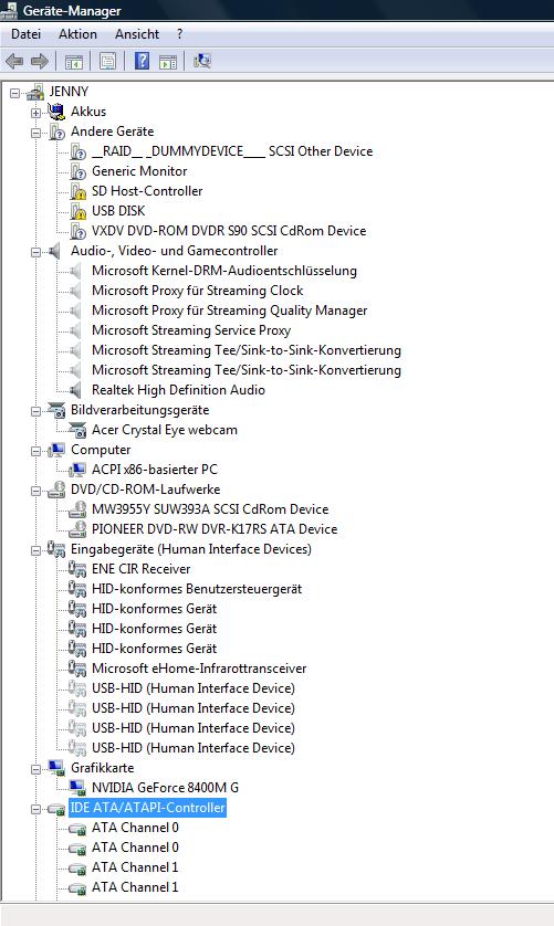 Die Prozedur bracht wiedermal keinen Erfolg. habe nun eine 500GB Multimediafestplatte, die erkennt Vista auch nicht. Lediglich meinen USB Stick (Intenso) erkennt der Rechner (1GB).