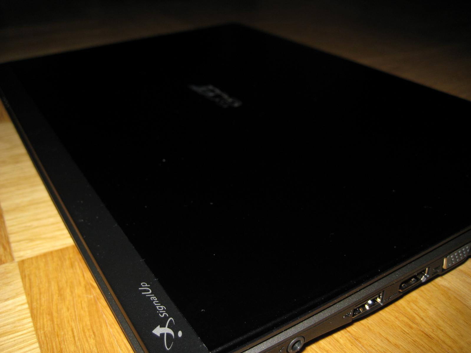 Auf dem Displayrahmen sieht man sofort jeden Fingerabdruck. Nun ja, ansonsten siehts aber edel aus und spiegelt den Kontrast. Das Display ist unglücklicherweise spiegelnd, kann man aber im ausgeschalteten Zustand als Spiegel verwenden.