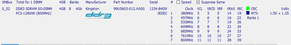 Wie ihr seht, Arbeiten beide RAM-Riegel mit unterschiedlicher Spannung (Oder ich verstehe die Beschriftung 1,5V +1,35V falsch). Beim 1,5V RAM-Riegel handelt es sich um ein