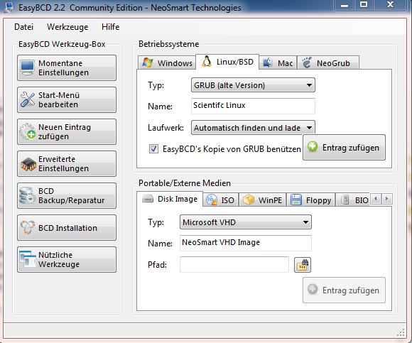 habe gestern sehr lange versucht, meinem PC Scientific Linux 6.4 in der 64bit Version beizubringen, irgendwie will es aber nicht funktionieren. Dass ein Windows Bootloader erforderlich ist, ist mir relativ bald klar geworden - so ein nettes EFI Special. Aber selbst mit Windows 7 und EasyBCD 2.2 schaffe ich es nicht, den Bootloader von Windows 7 mit dem installierten Linux zu verbinden, sprich einen funktionierenden Eintrag in den Bootloader für Chainboot zu erzeugen.