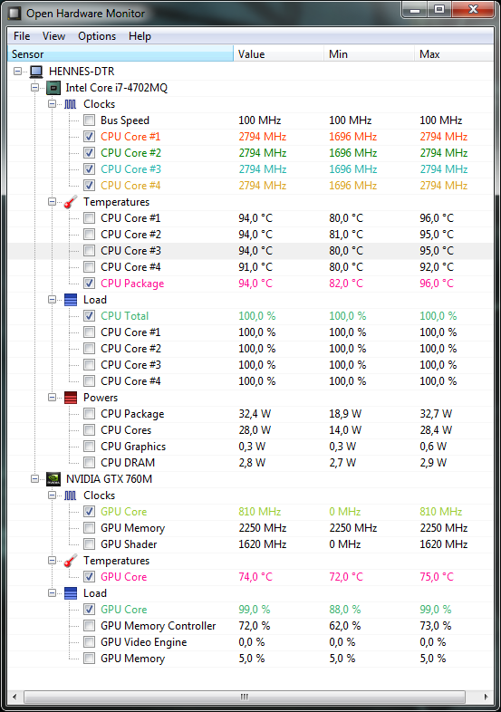 Lässt man Prime95 alleine laufen, steigt die maximale Temperatur nie über 87°, allerdings scheint Prime95 die CPU an die Grenze der TDP zu bringen, denn der volle Turbo Takt von 2,9 GHz wird nicht mehr erreicht, es sind "nur" 2,8 GHz. Läßt man dann jetzt noch Furmark mit dem Preset "Extreme" laufen steigen die Temperaturen und der CPU Takt schwankt ab ca. 85° zwischen 2,7 und 2,8 GHz. Von Throttling ist erstmal nichts zu sehen.