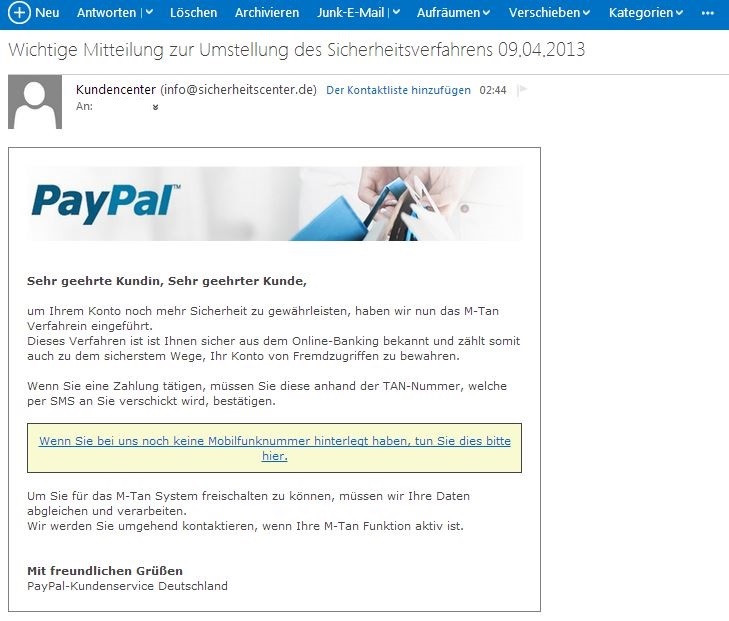 Es wird mit einem neuen Sicherheitsverfahren bei der PayPal Transaktion geworden. Man wird aufgefordert sich für ein kostenloses M-TAN Verfahren anzumelden, dabei werden vermutlich die PayPal Datenbestände (E-Mail Adresse + Passwort) gefished.
