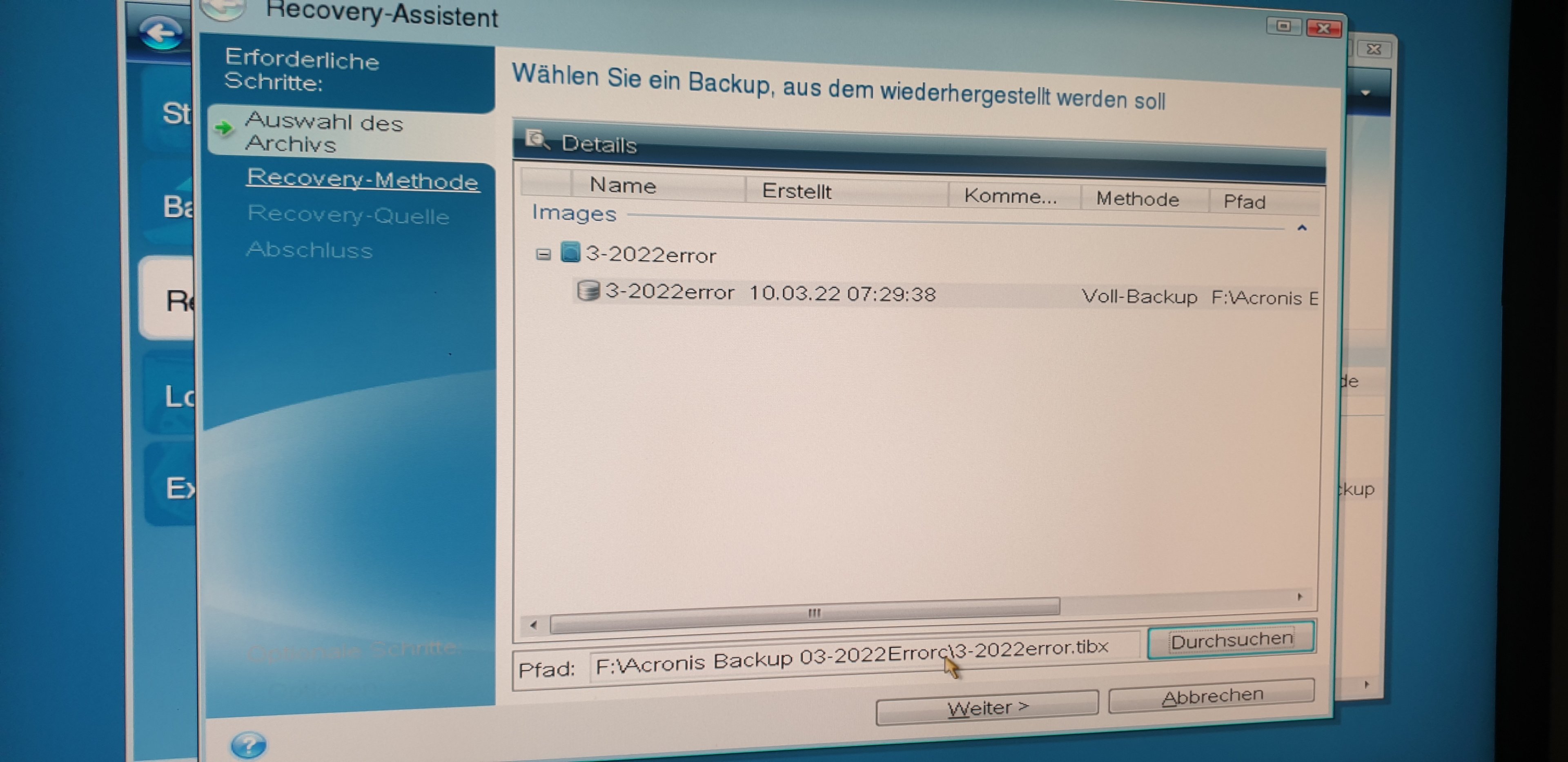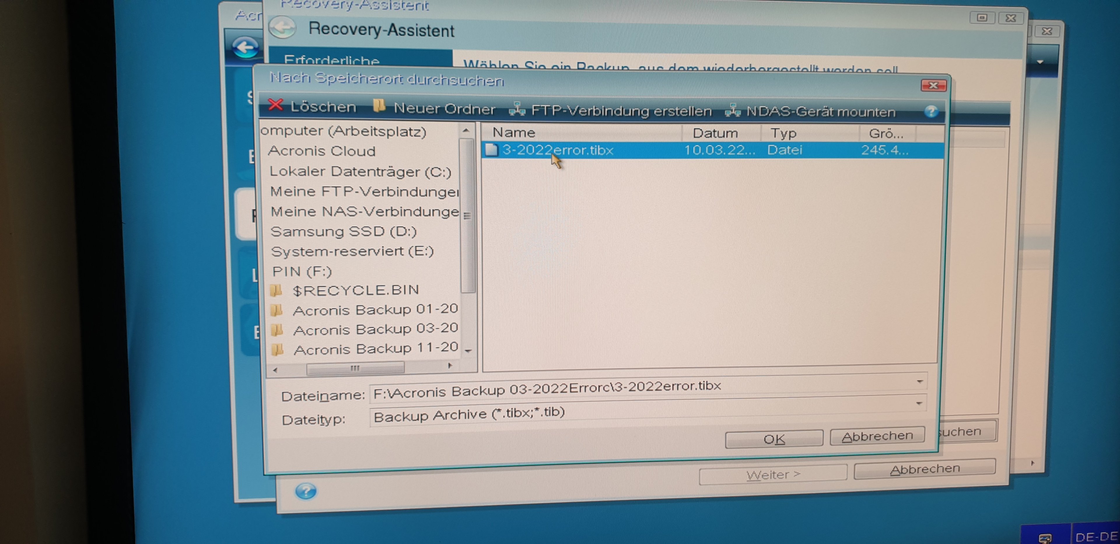Goldsmith schrieb:Sieht doch wohl so aus, als ob dein Backup beschädigt ist, warum sonst wird es mit 3-2022error.tibx bezeichnet.
