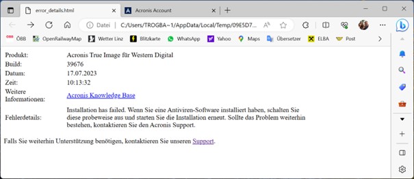 Daher hab ich mir die neueste Version von Acronis True Image für WD heruntergeladen: leider bricht die Installation immer wieder an der gleichen Stelle ab. Als Fehlerhinweis poppt auf, dass ich ev. das AntiVirus-Programm - in diesem Falle der MS Defender - deaktivieren soll (siehe Screenshot), das nützte aber auch nichts. Auch hab ich sämtliche Firewalls deaktiviert: nicht zielführend!
