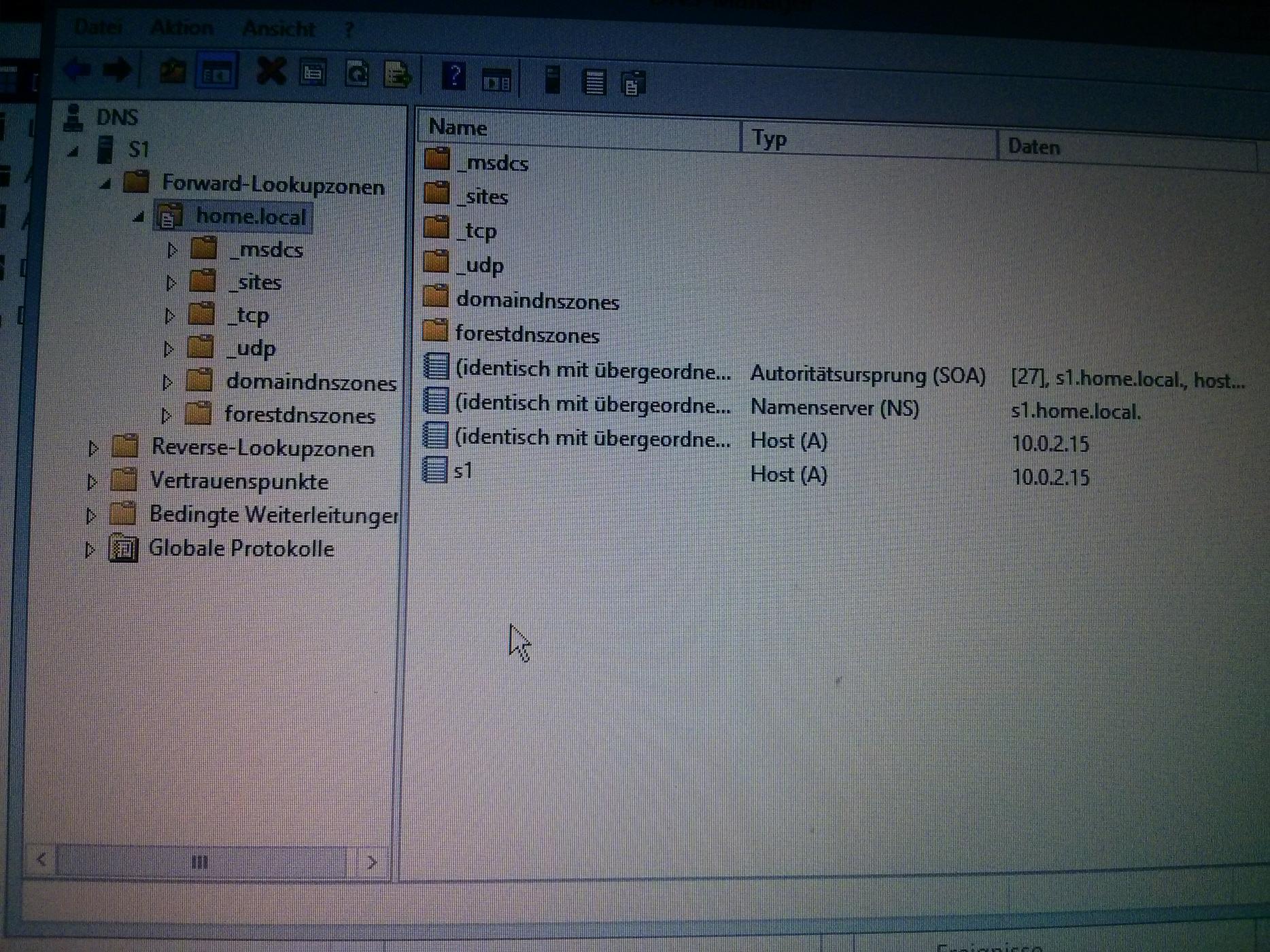 Im DNS habe ich eine Reverse- und Forward-Lookupzone eingerichtet, Dynamische Updates habe ich auf Nicht sichere und sichere gestellt. Der Server wurde automatisch mit dem Servernamen bzw. der IP eingetragen.
