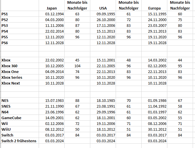 Microsoft rechnet mit einem 2028-PS6-Launch (voraussichtlich wieder November) und wird die nächste Xbox auch entsprechend planen... dort wären wir bereits bei 96 Monaten (8 Jahren).
