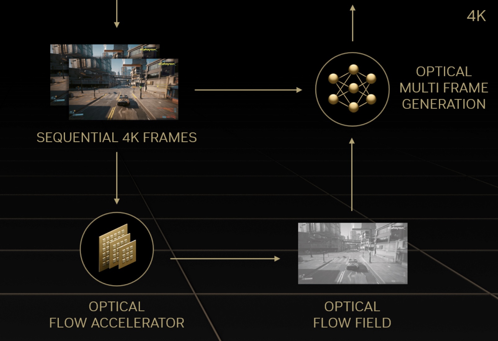 Da DLSS 3 auch die künstlich generierten Frames aus echten Szenendaten speist, deren Pixel nach der Steuereingabe den Endpunkt ihres Vektors finden (egal ob nativ oder hochgerechnet), kann sich natürlich auch der Inputlag rein durch interpolierte Bilder senken.