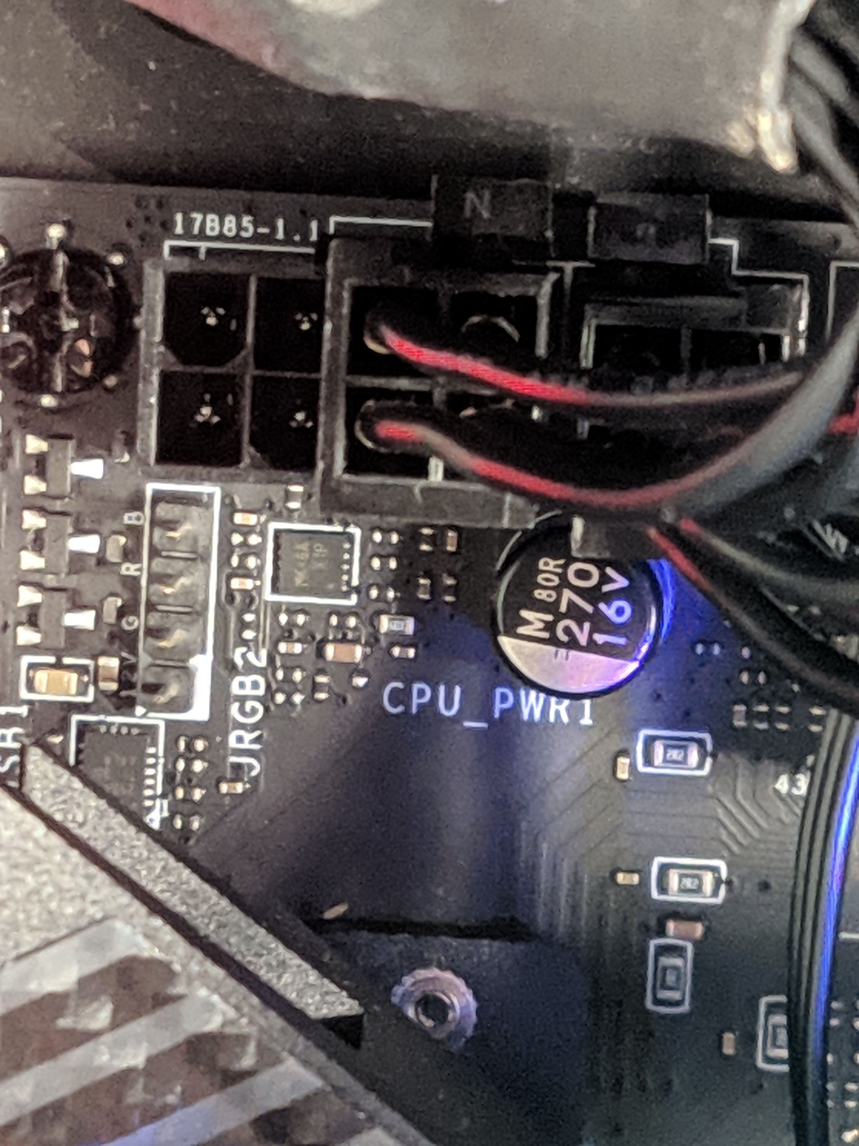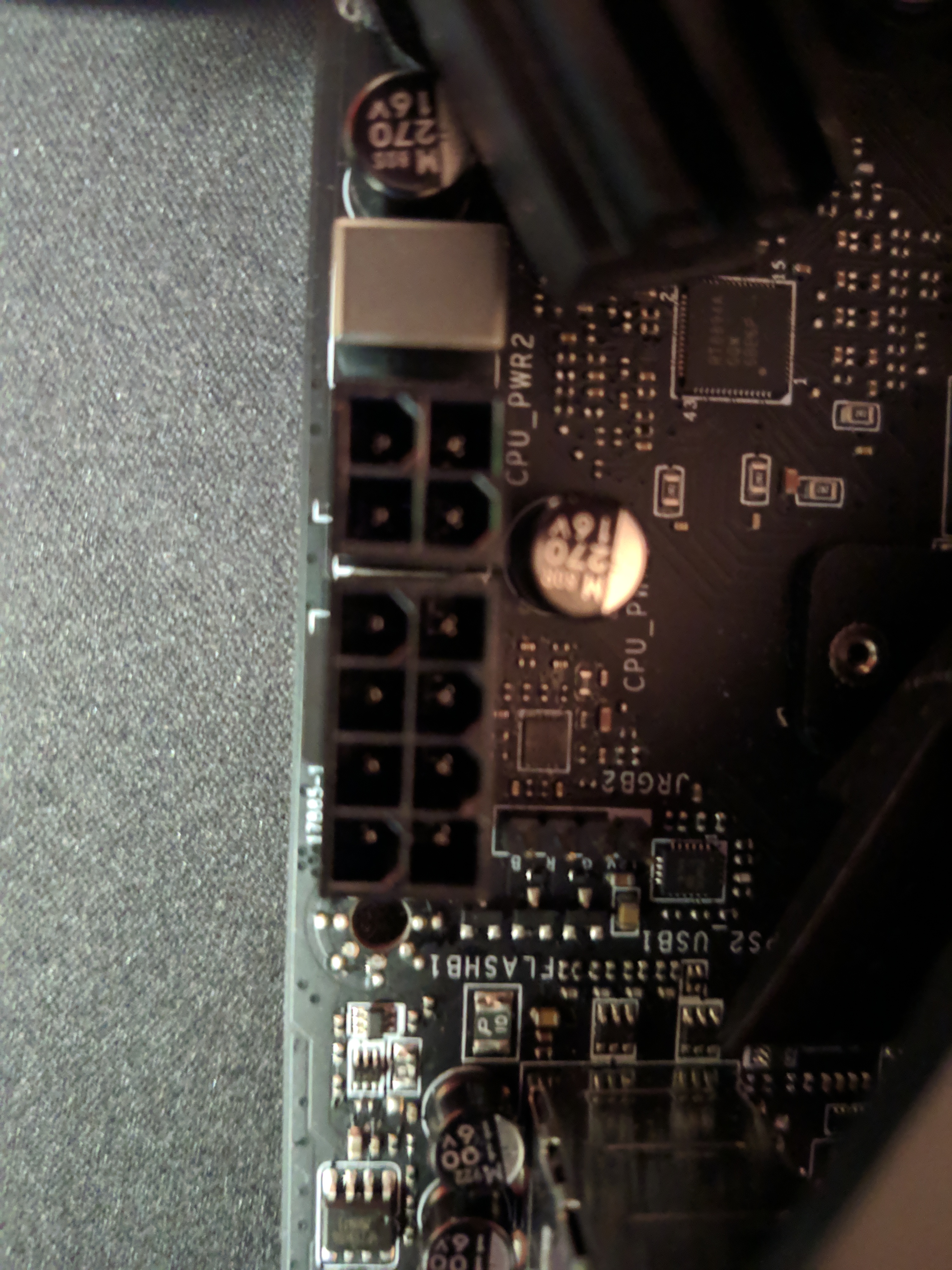 Im Bild 1 sieht es so aus als wenn du 1x4 Pin bei CPU PWR 1 und das andere Kabel an CPU PWR 2 angeschlossen hast, der 8-PIN gehört komplett in CPU PWR 1, CPU PWR 2 ist optional.