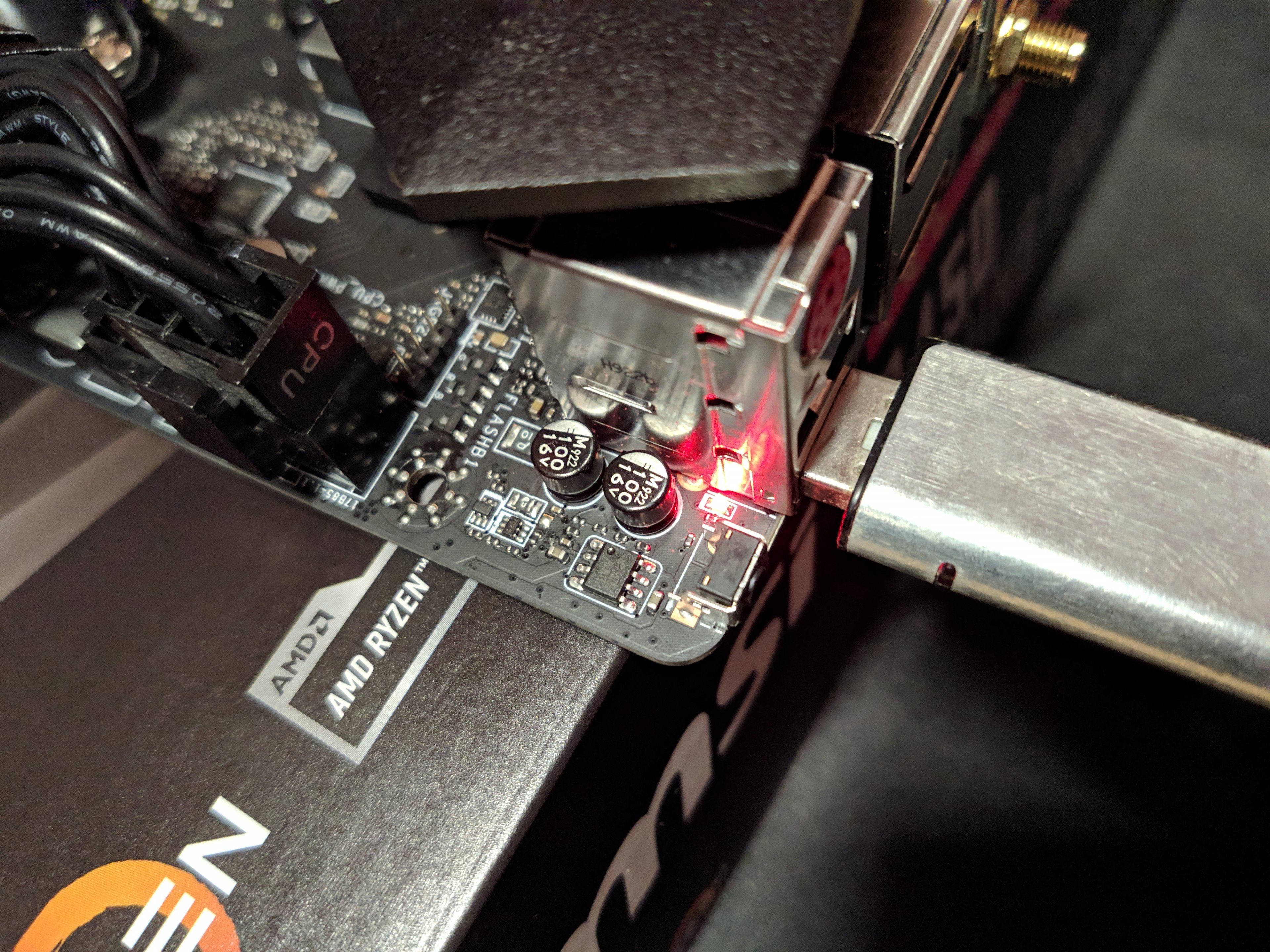 3. Flashback durchführen (USB-Stick in USB-Port direkt neben dem FLashback-Button), ca. 5 Minuten warten, das Mainboard sollte erst langsam rot blinken und im laufe des Flashbacks schneller. Warten bis sich nichts mehr rührt.