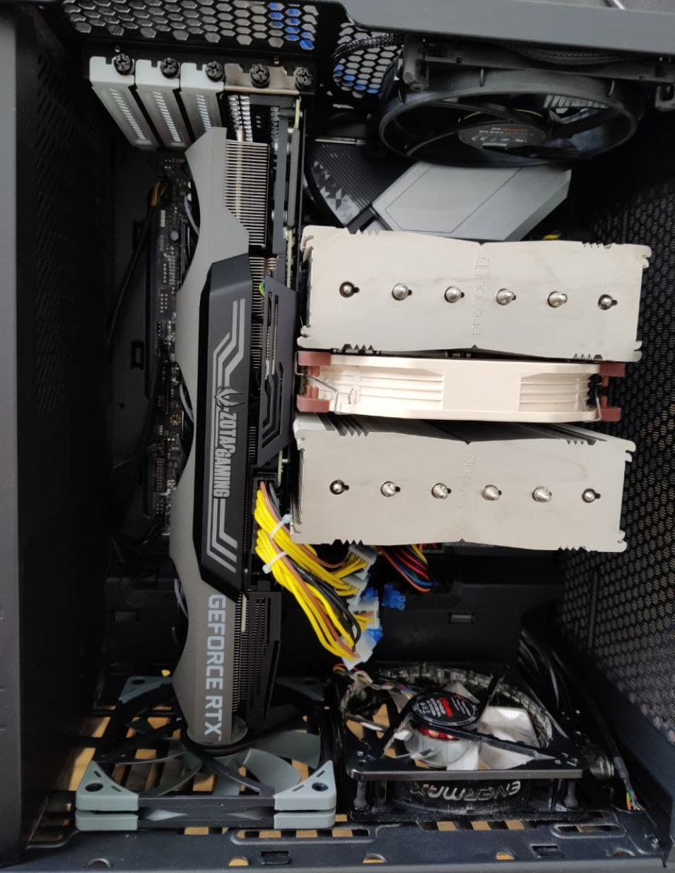 Zotac war leider zu geizig schöne (sleeved) Adapter reinzulegen geschweige denn, dass diese recht hässlich gelben bei der Preisklasse einfach ein bisschen länger sind, dass sie wenigstens hinter die Grafikkarte reichen. Aber ich will mich nicht aufregen.